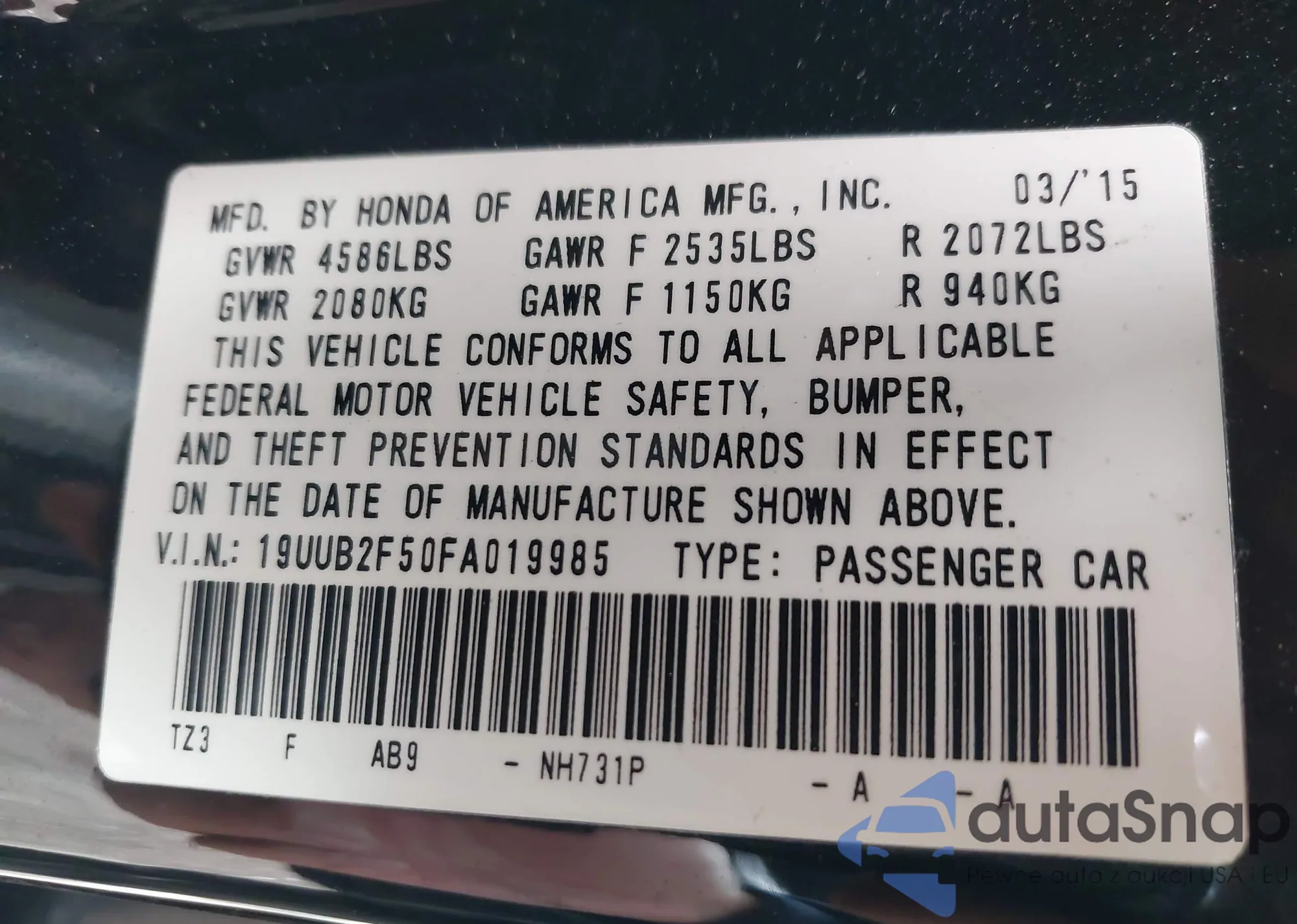 • VIN 19UUB2F50FA019985