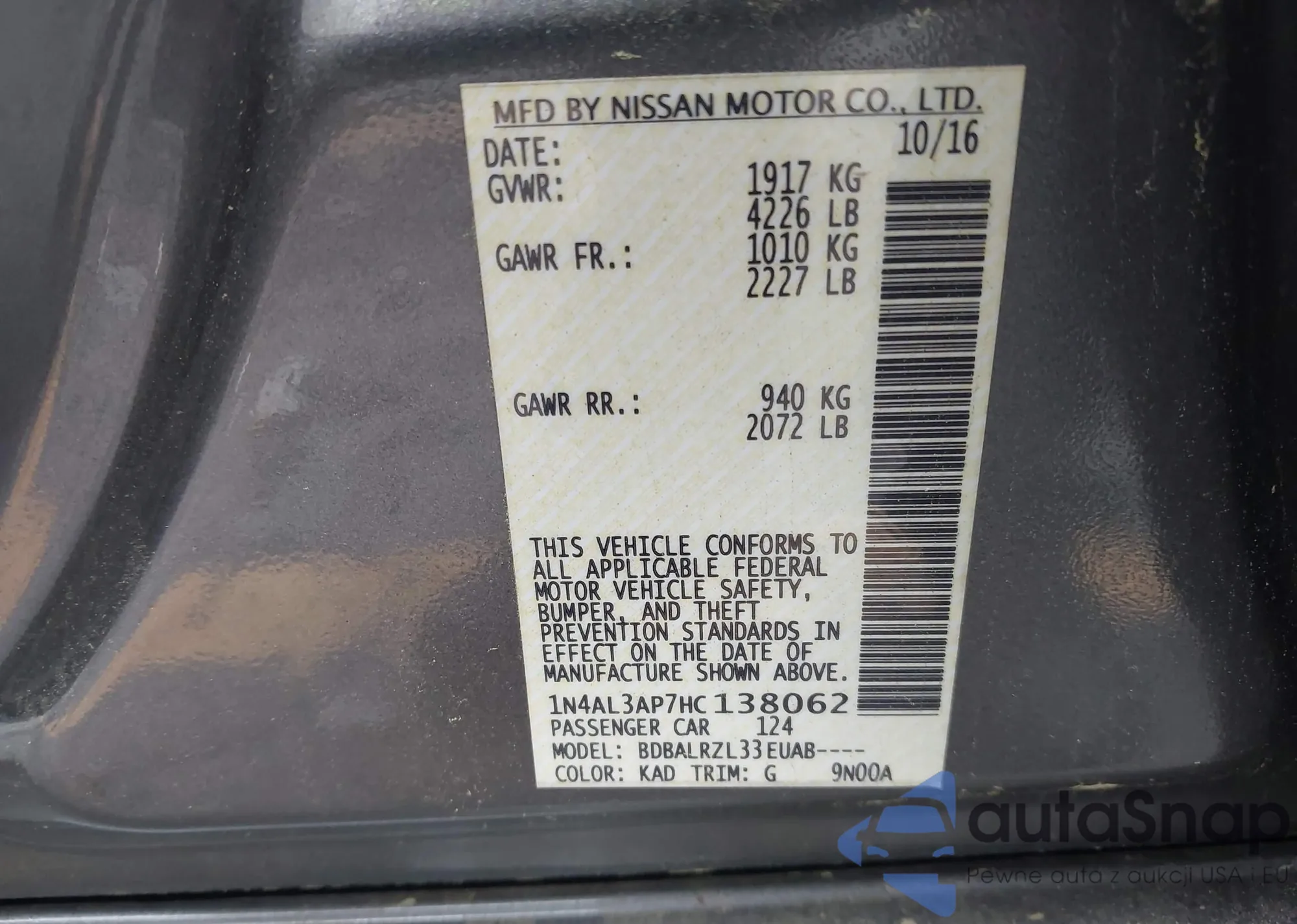 • VIN 1N4AL3AP7HC138062
