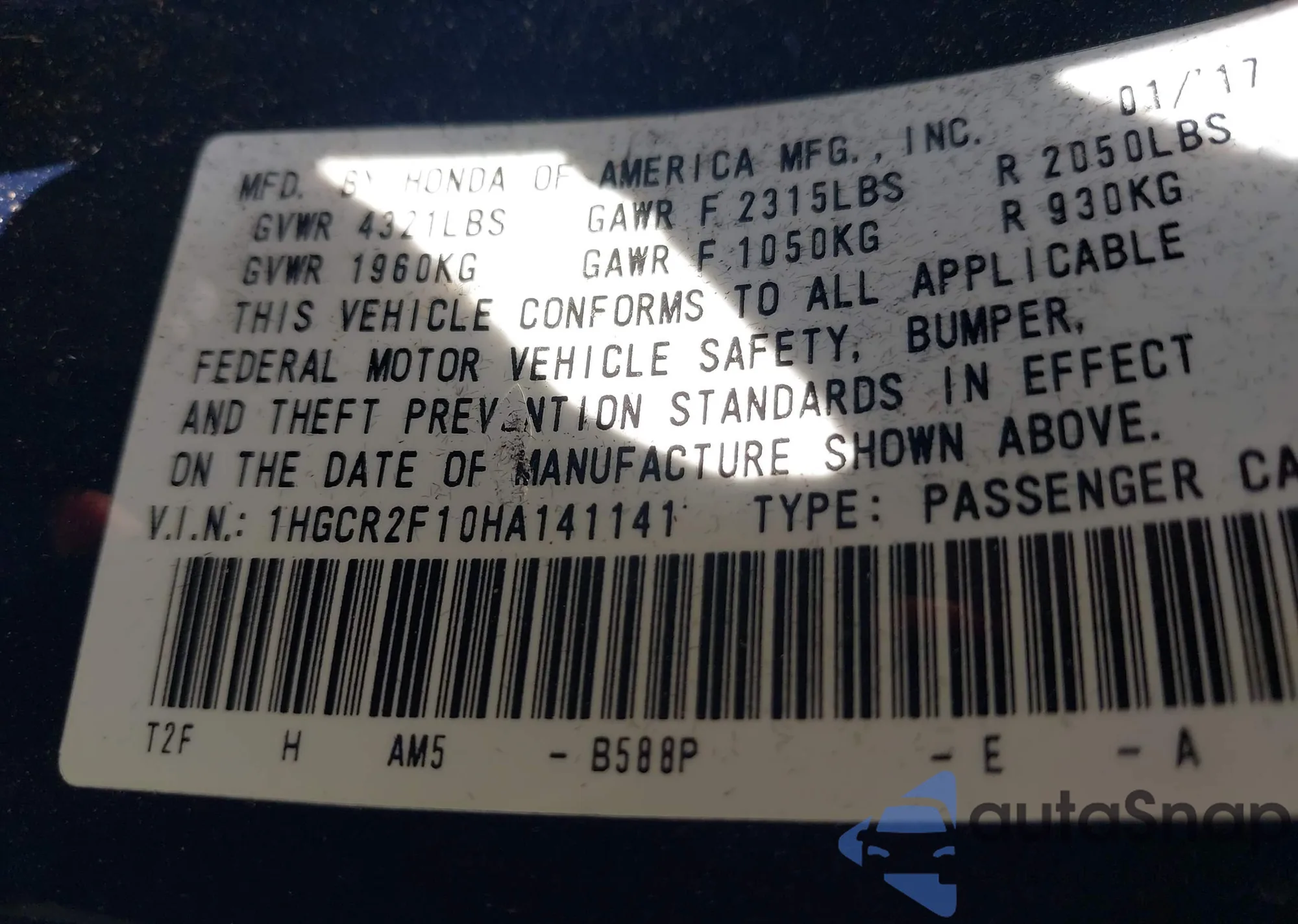 • VIN 1HGCR2F10HA141141