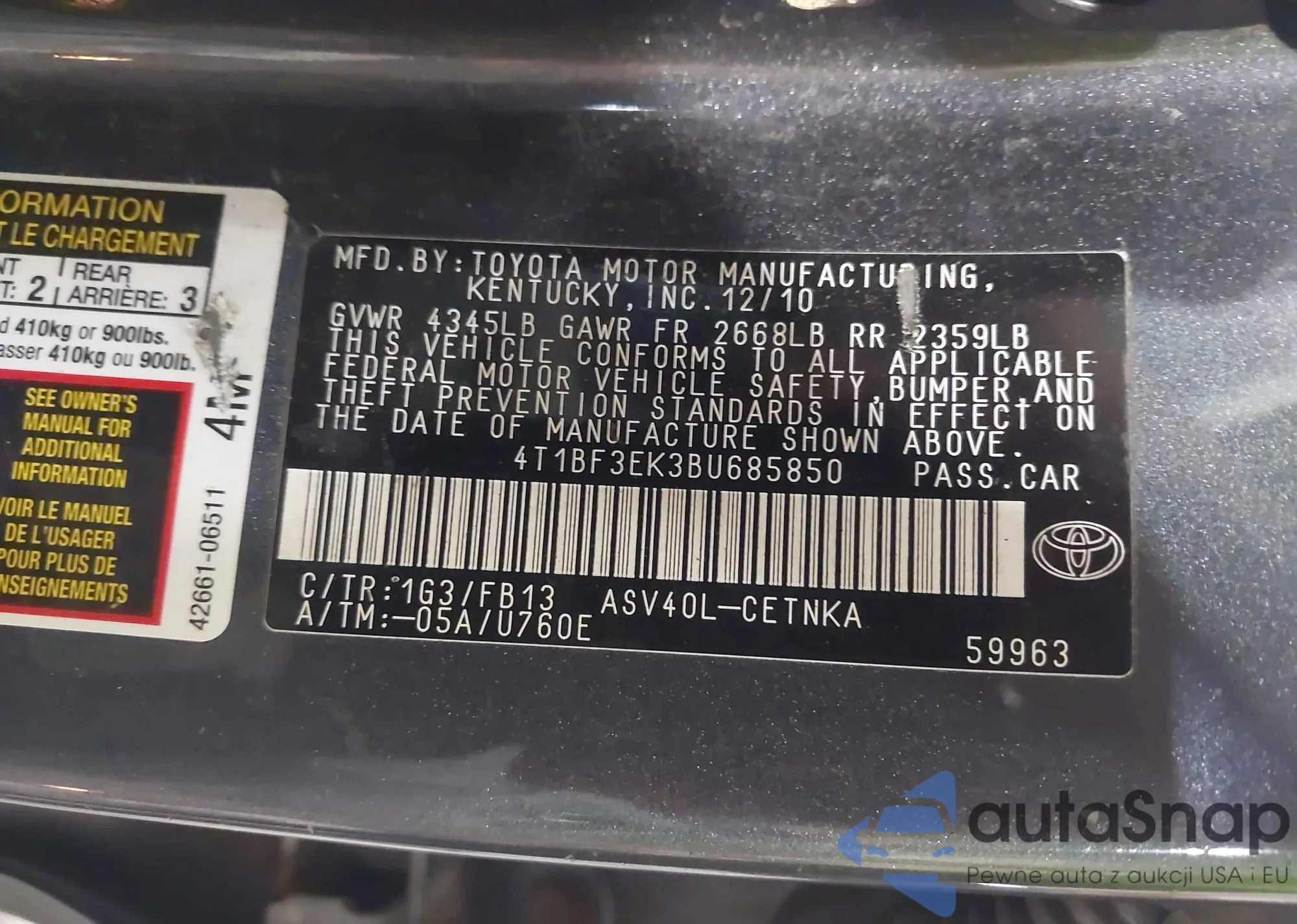 • VIN 4T1BF3EK3BU685850