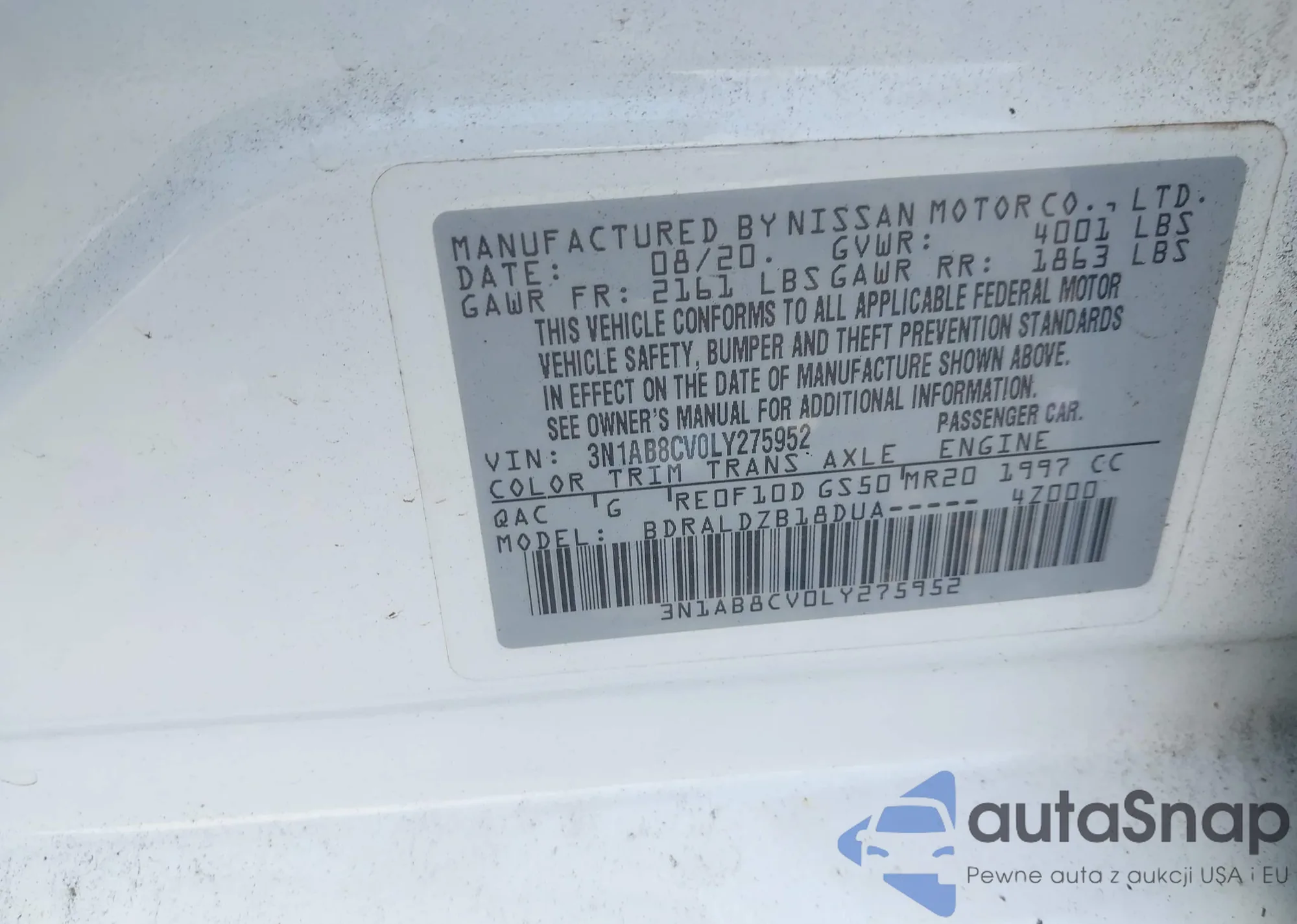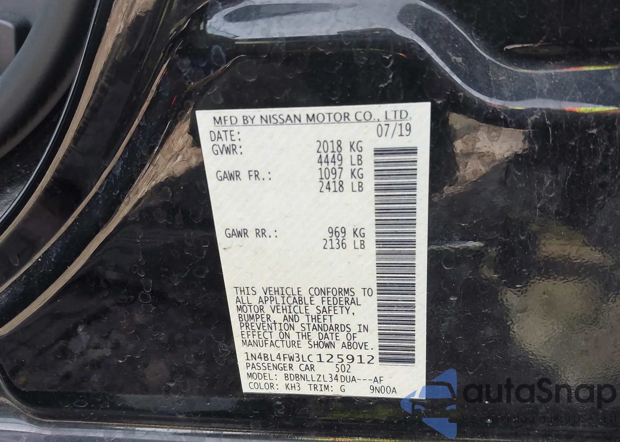 • VIN 1N4BL4FW3LC125912