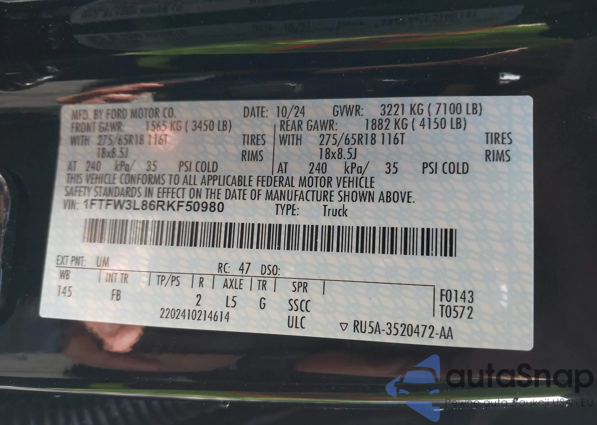 LOT: 41744890 VIN: 1FTFW3L86RKF50980