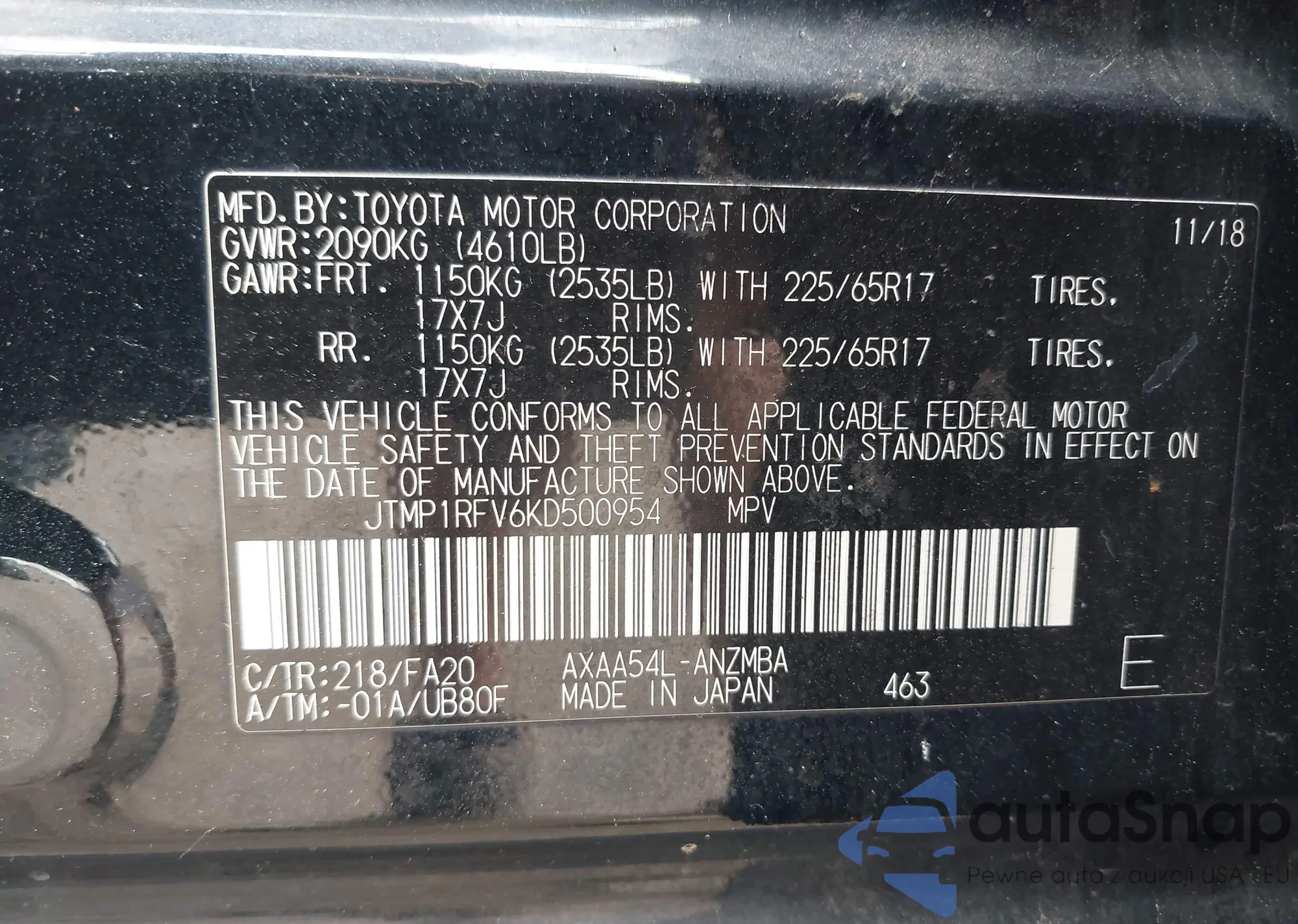 • VIN JTMP1RFV6KD500954