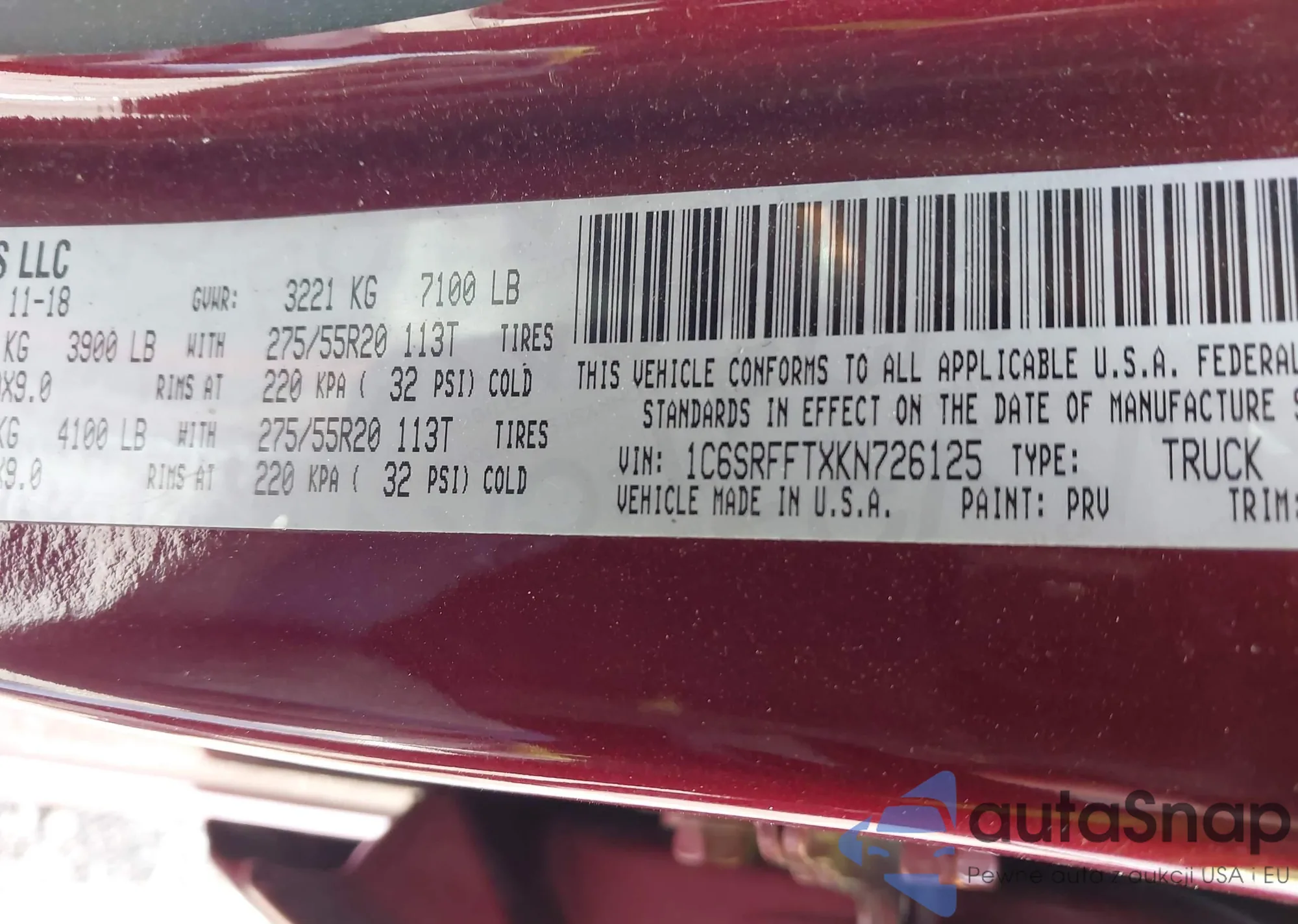 • VIN 1C6SRFFTXKN726125