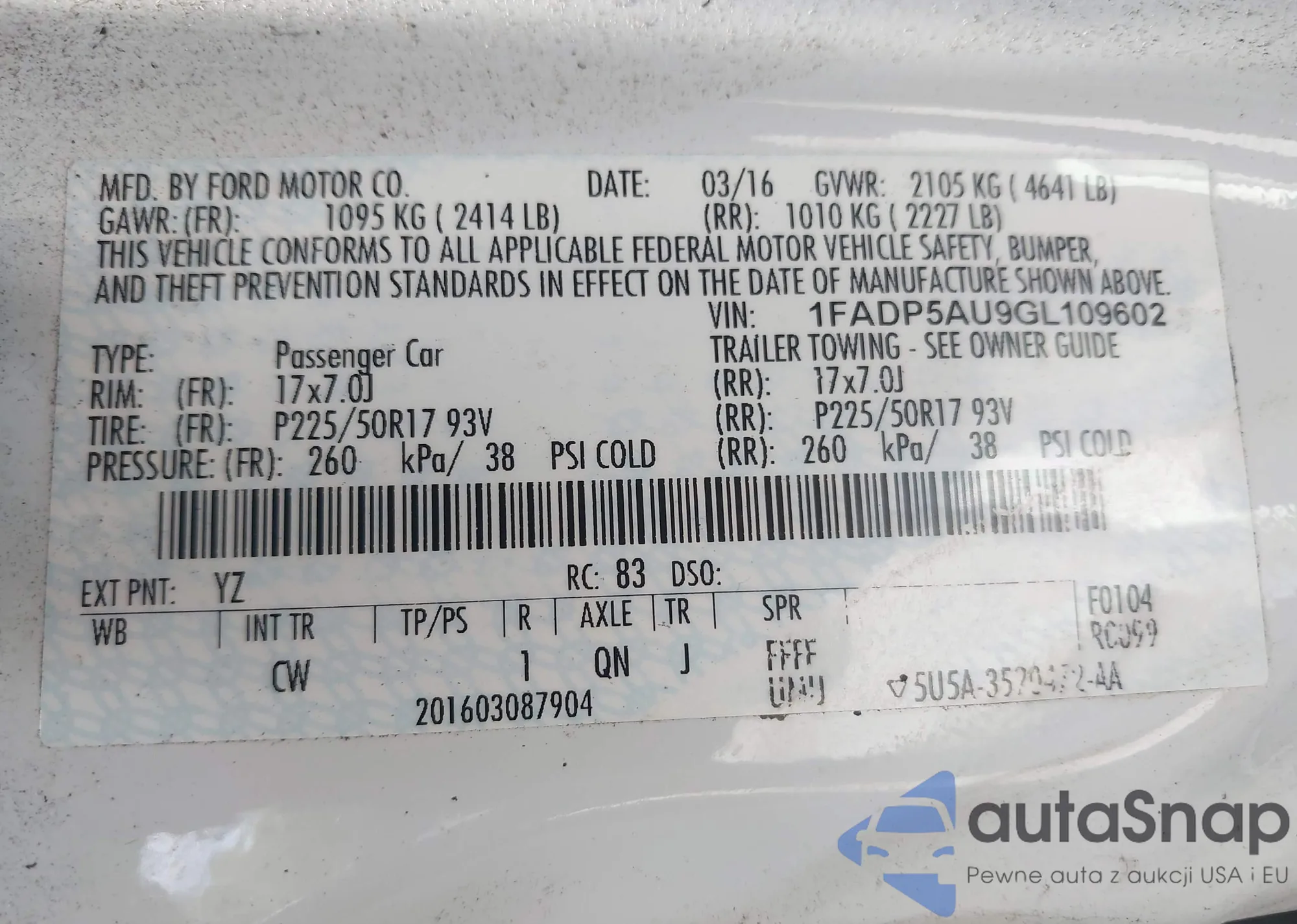 • VIN 1FADP5AU9GL109602