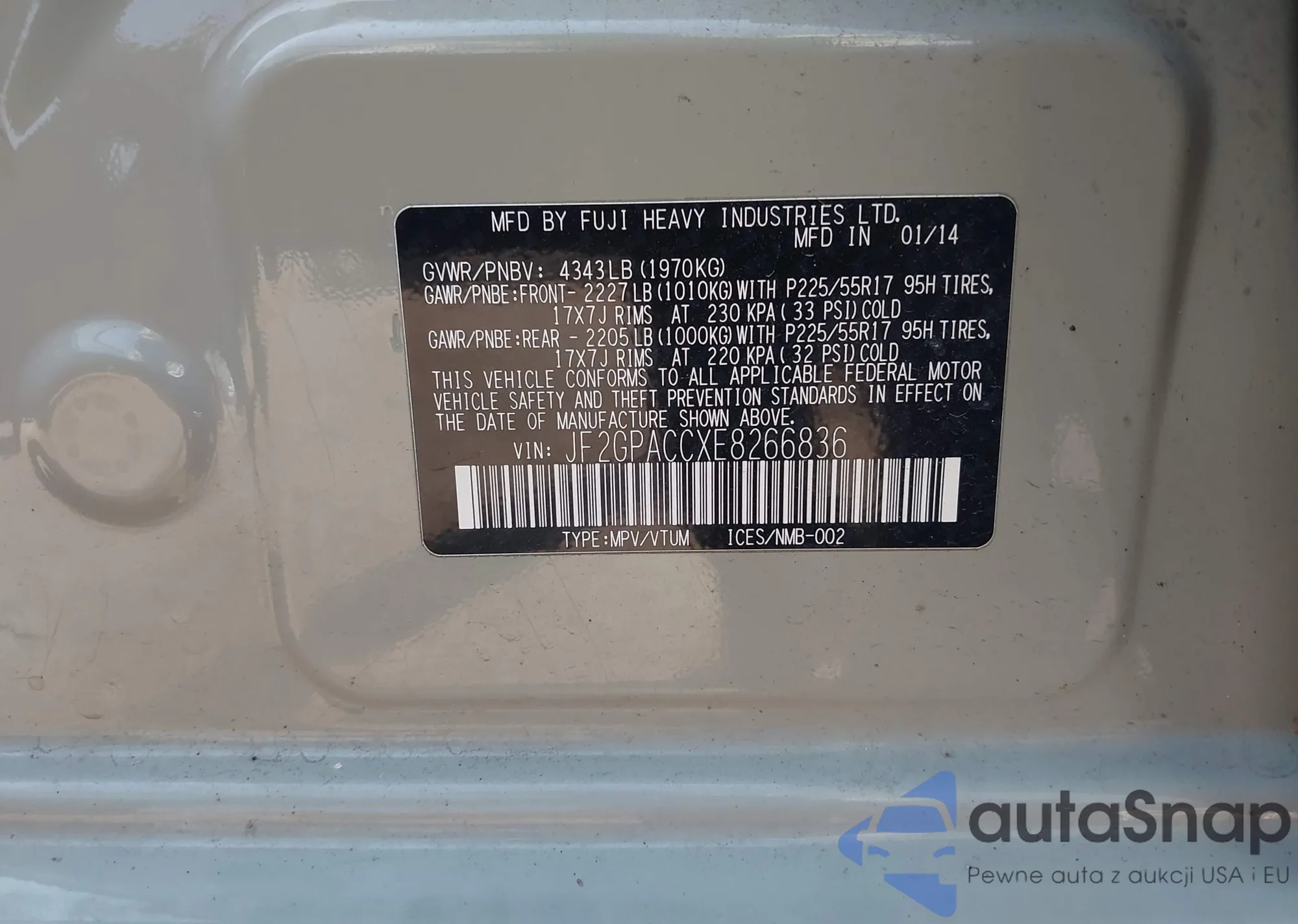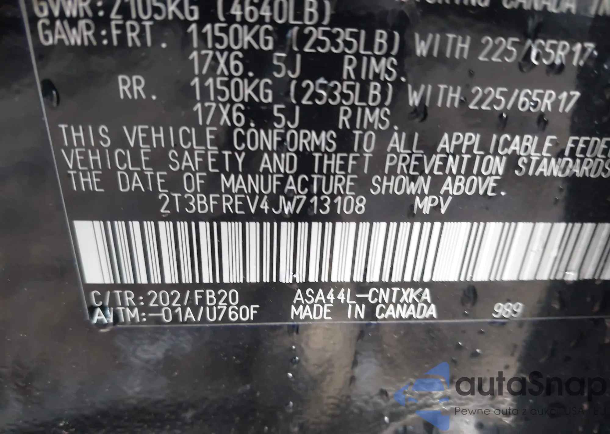 LOT: 42480002 VIN: 2T3BFREV4JW713108