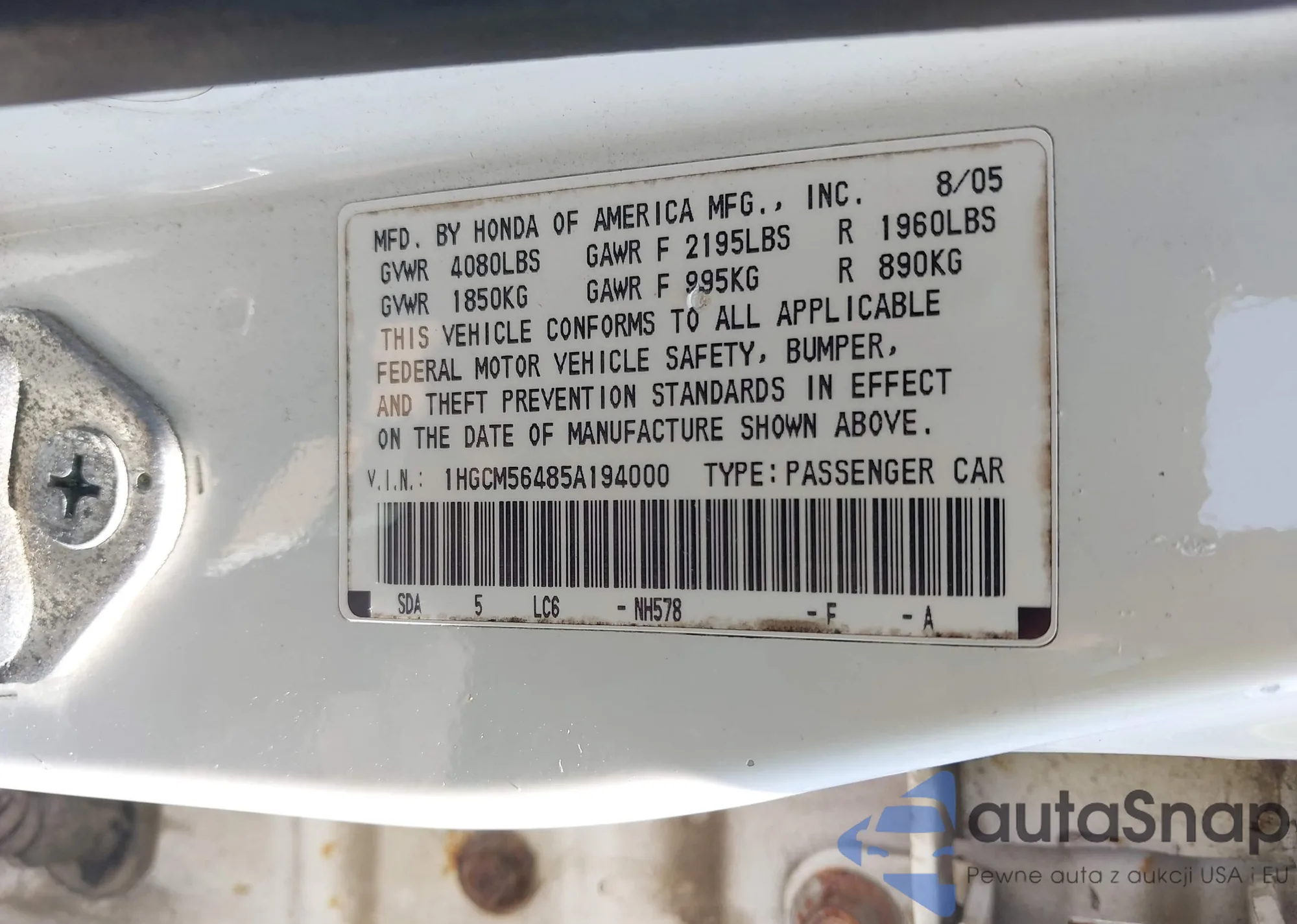 LOT: 42657508 VIN: 1HGCM56485A194000