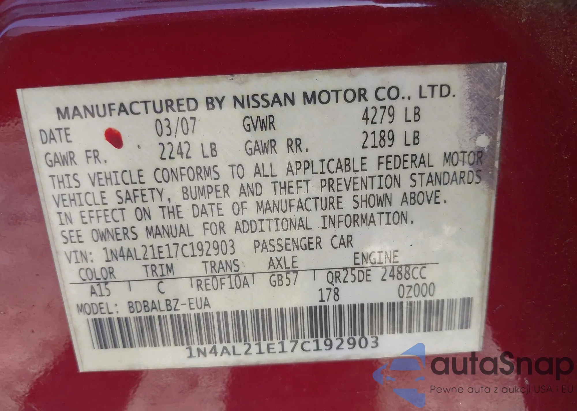 LOT: 42717367 VIN: 1N4AL21E17C192903