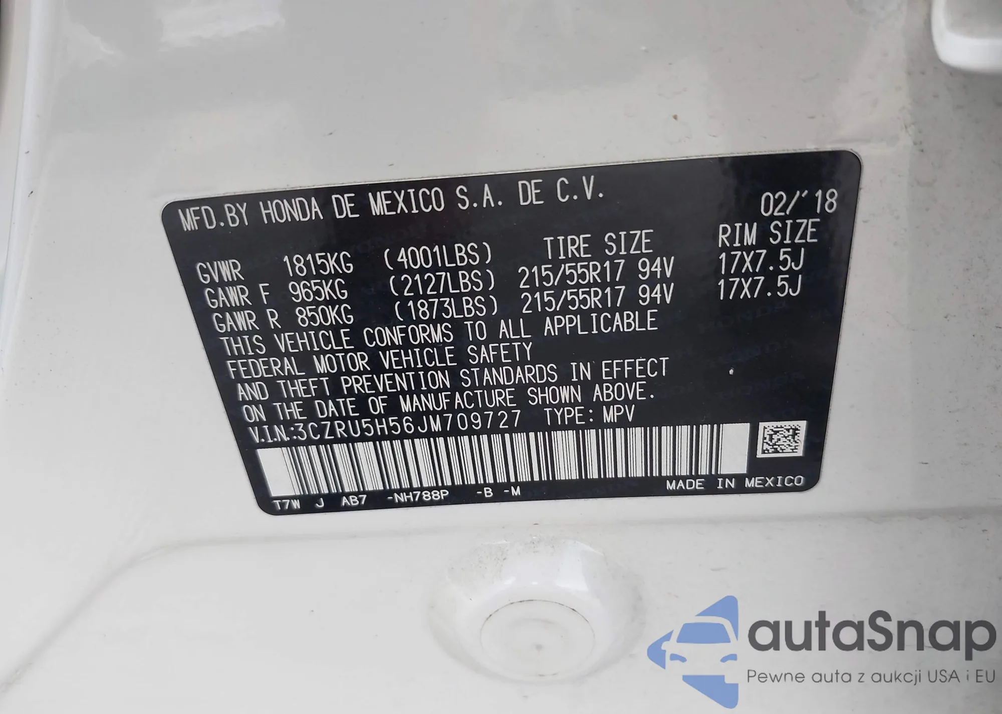 • VIN 3CZRU5H56JM709727