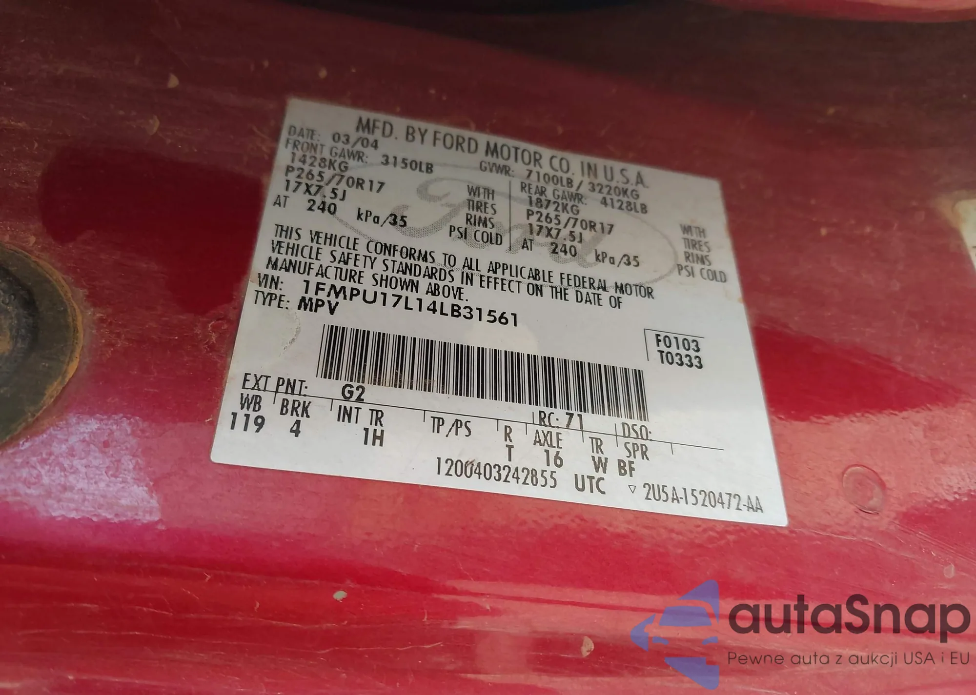 • VIN 1FMPU17L14LB31561