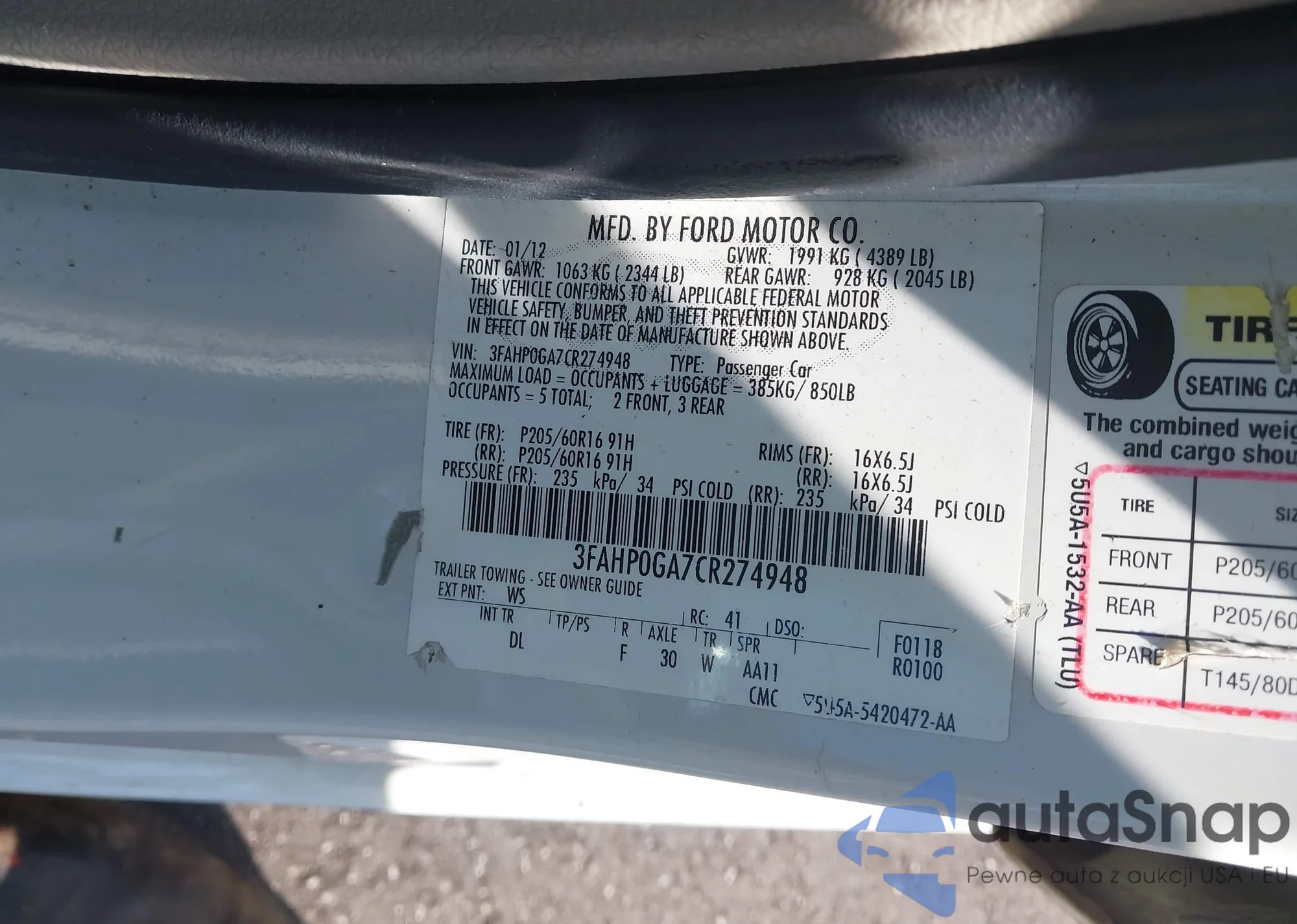 • VIN 3FAHP0GA7CR274948