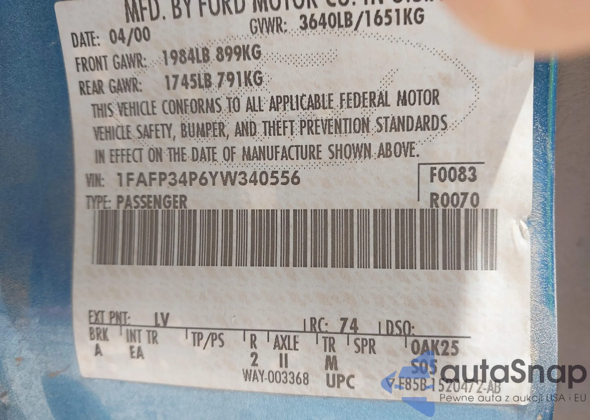 • VIN 1FAFP34P6YW340556