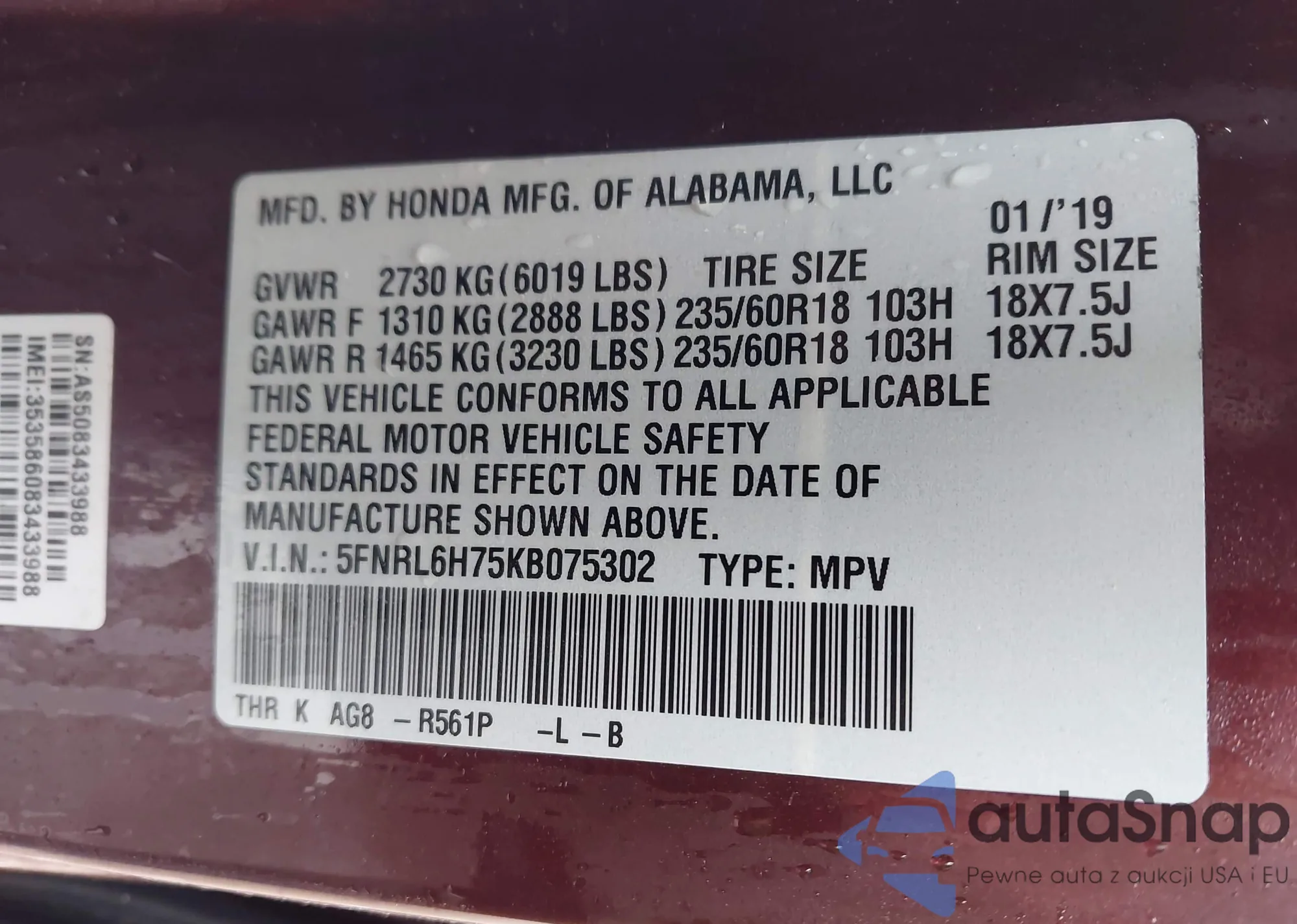 LOT: 42715944 VIN: 2HKYF18576H564750