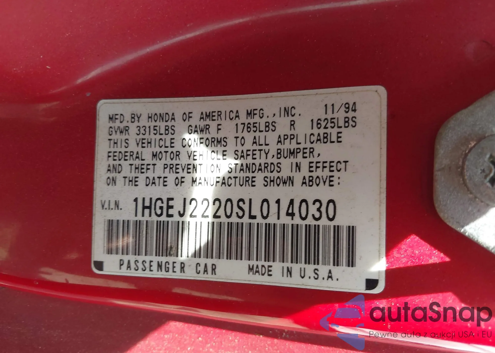 LOT: 42285542 VIN: 1HGEJ2220SL014030