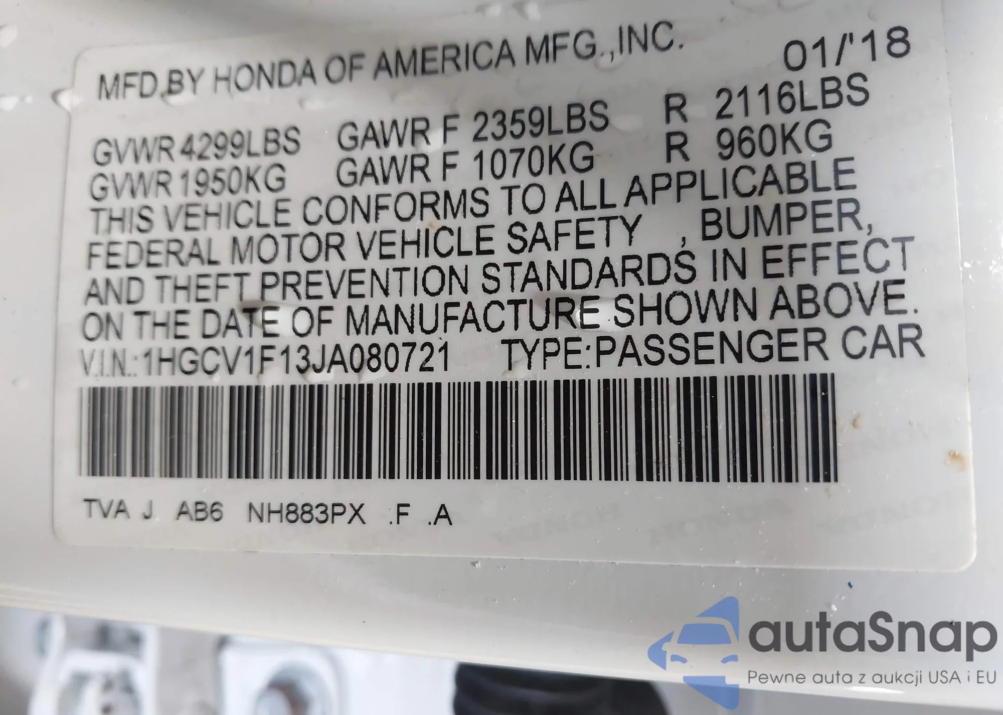 LOT: 42440606 VIN: 1HGCV1F13JA080721