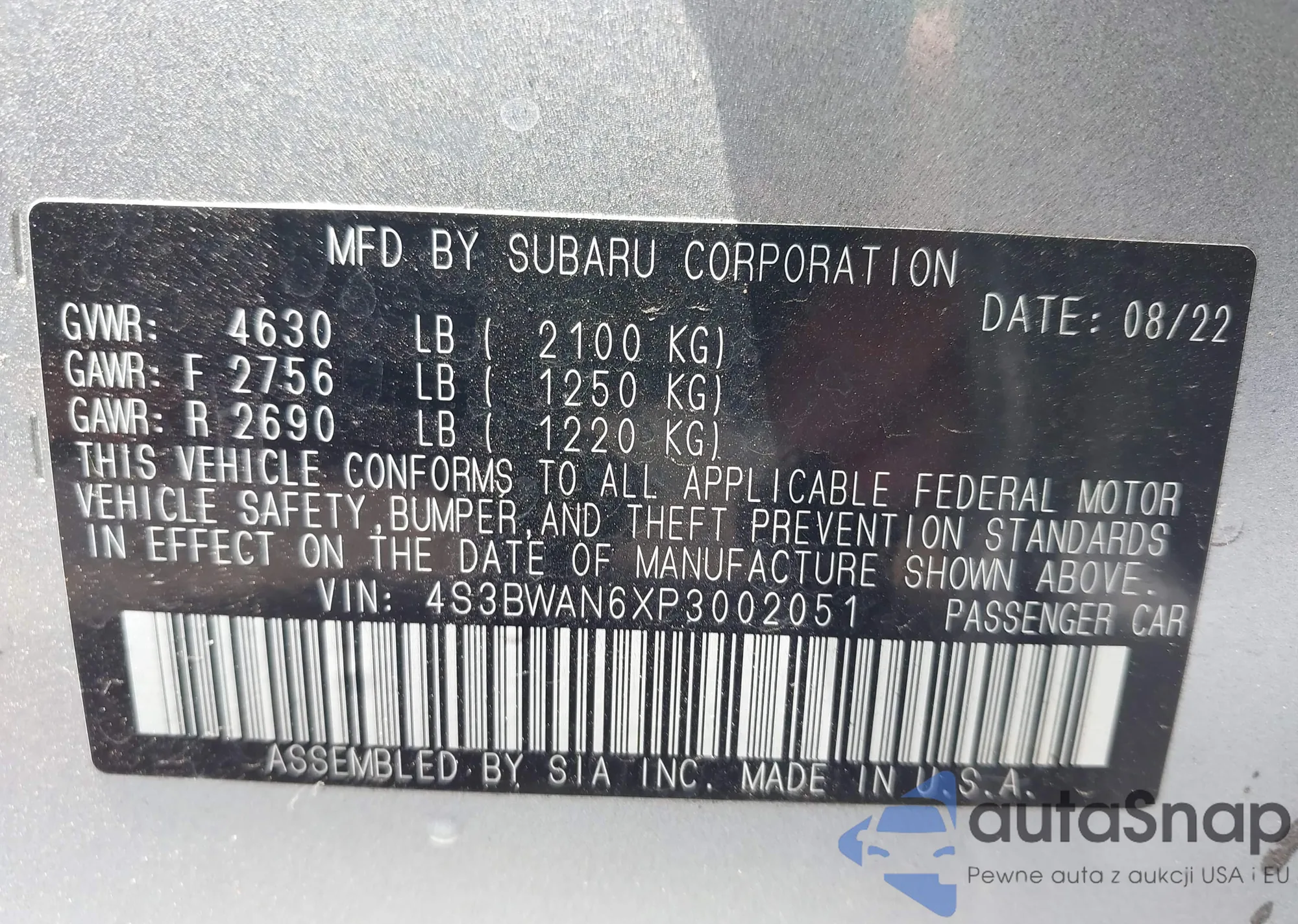 • VIN 4S3BWAN6XP3002051