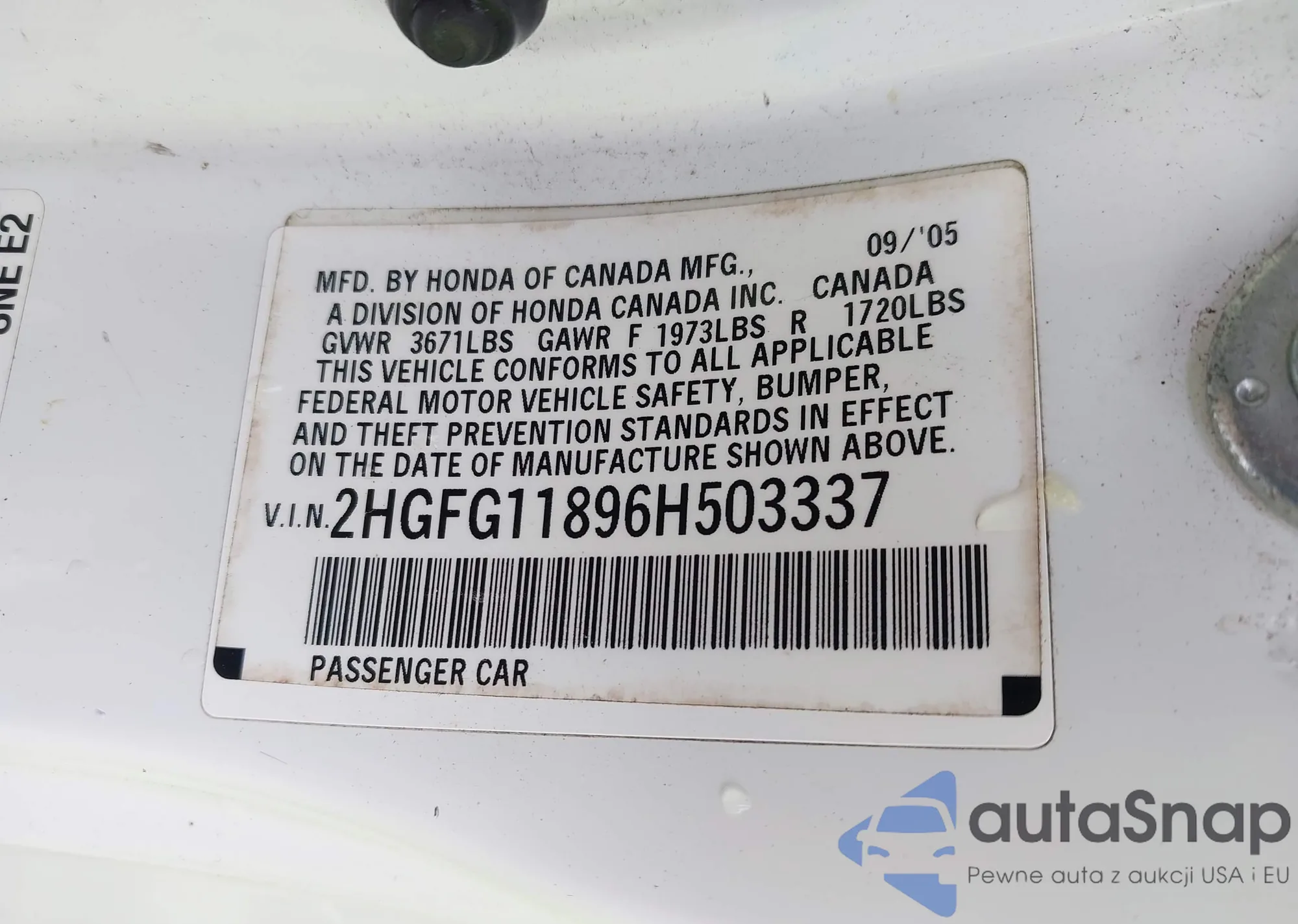 LOT: 42622353 VIN: 2HGFG11896H503337