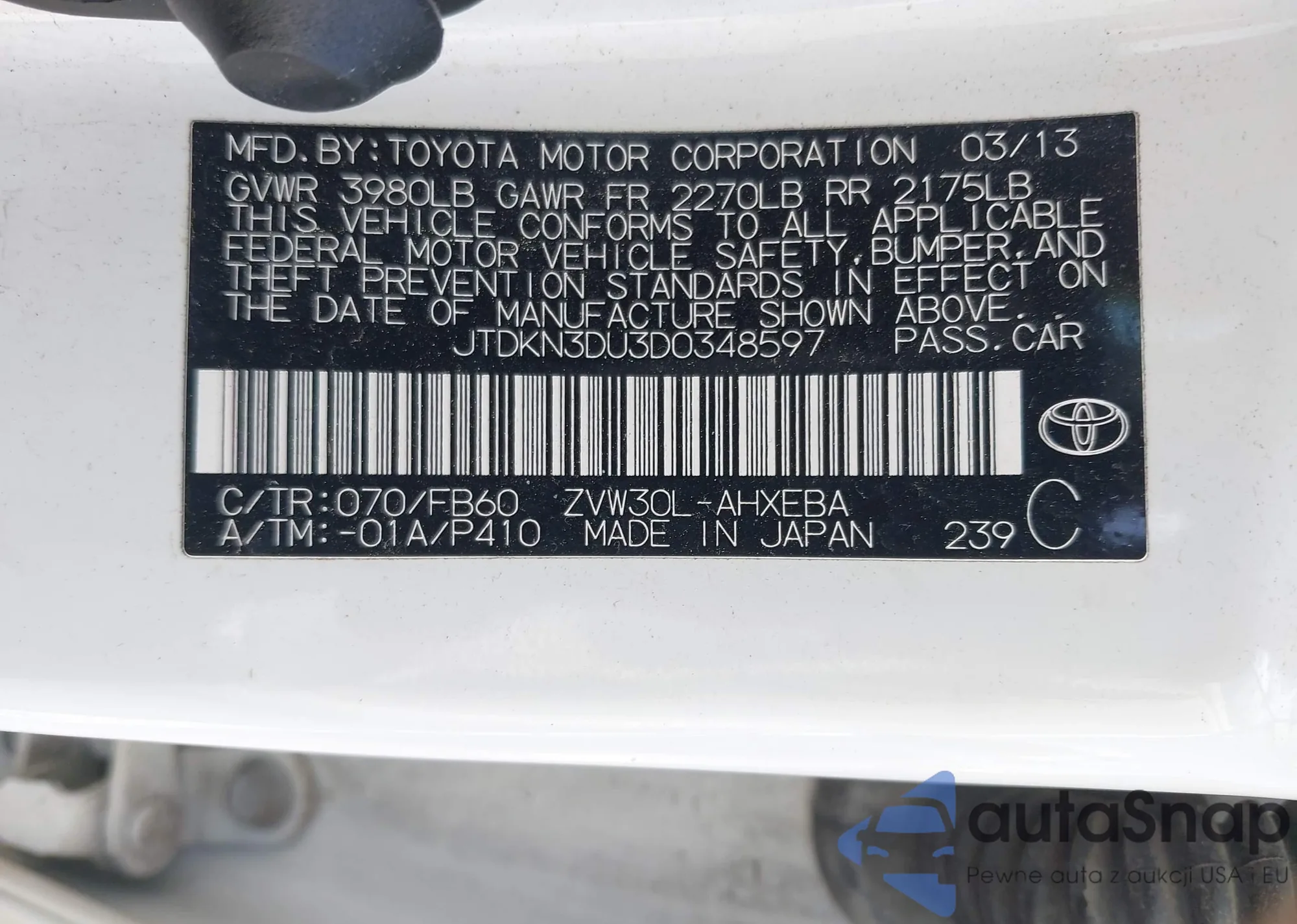 LOT: 42370978 VIN: JTDKN3DU3D0348597