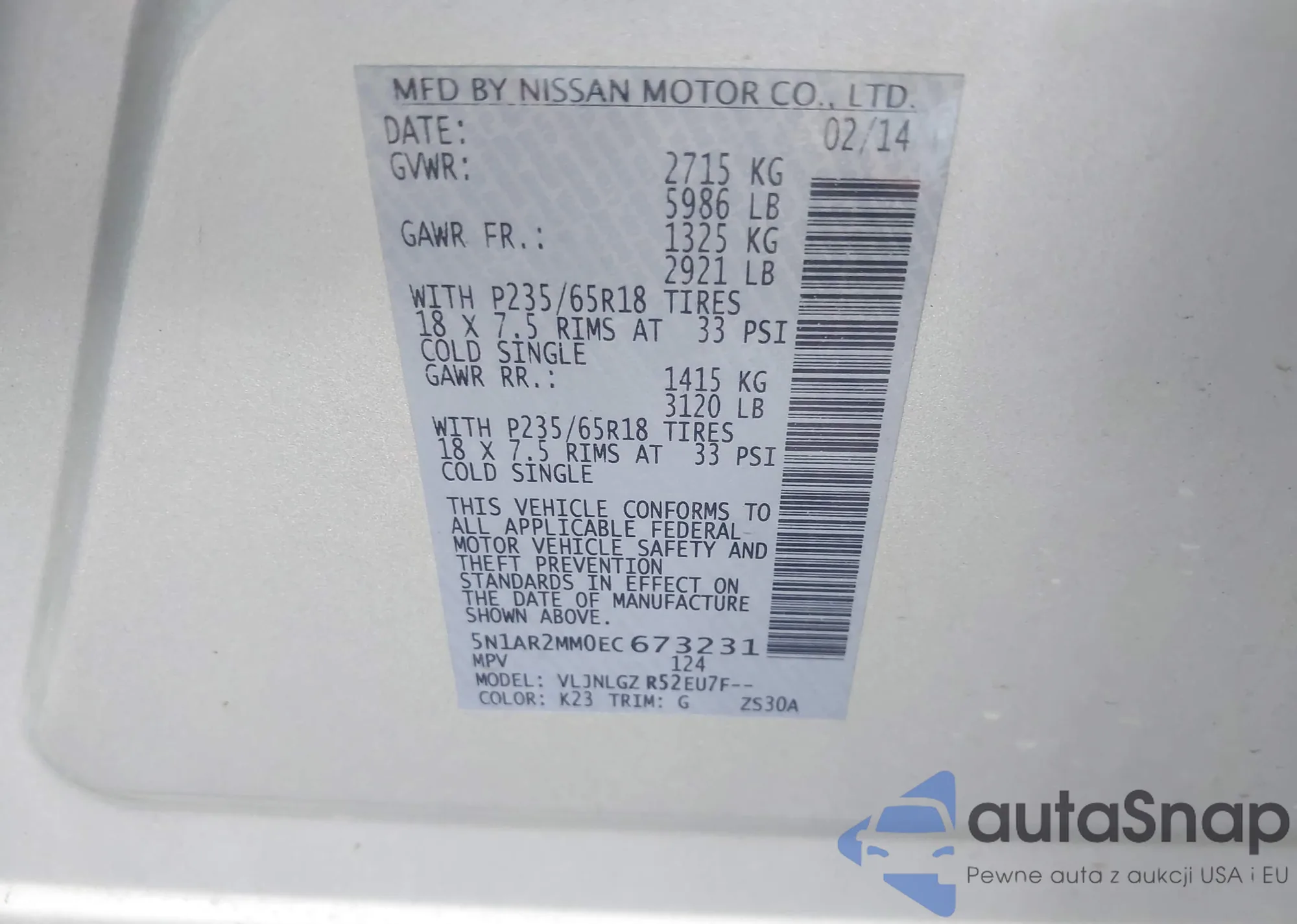 LOT: 42482133 VIN: 5N1AR2MM0EC673231