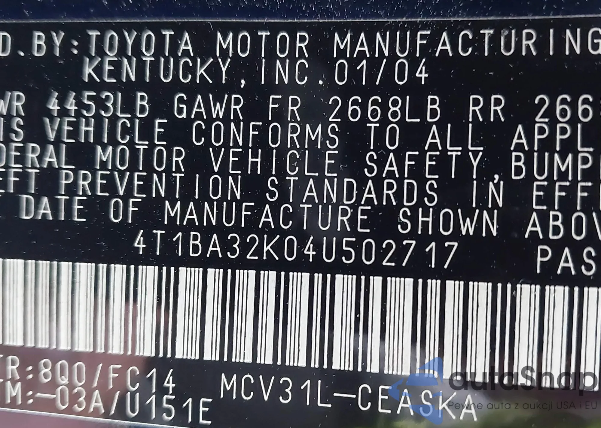• VIN 4T1BA32K04U502717