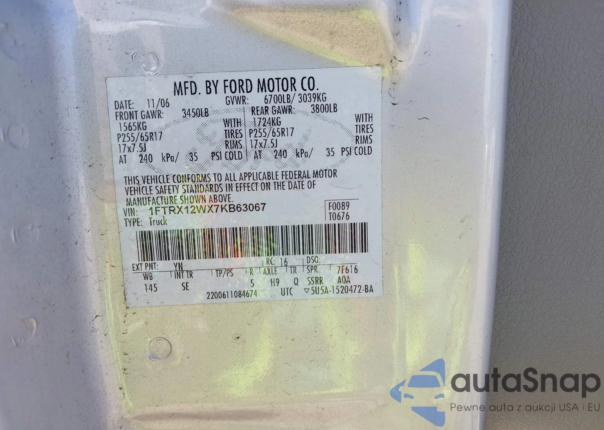 • VIN 1FTRX12WX7KB63067