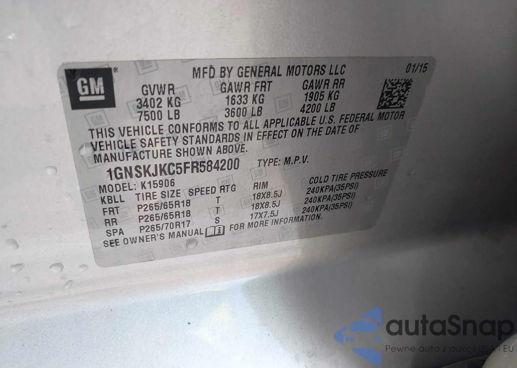 LOT: 42646082 VIN: 1GNSKJKC5FR584200