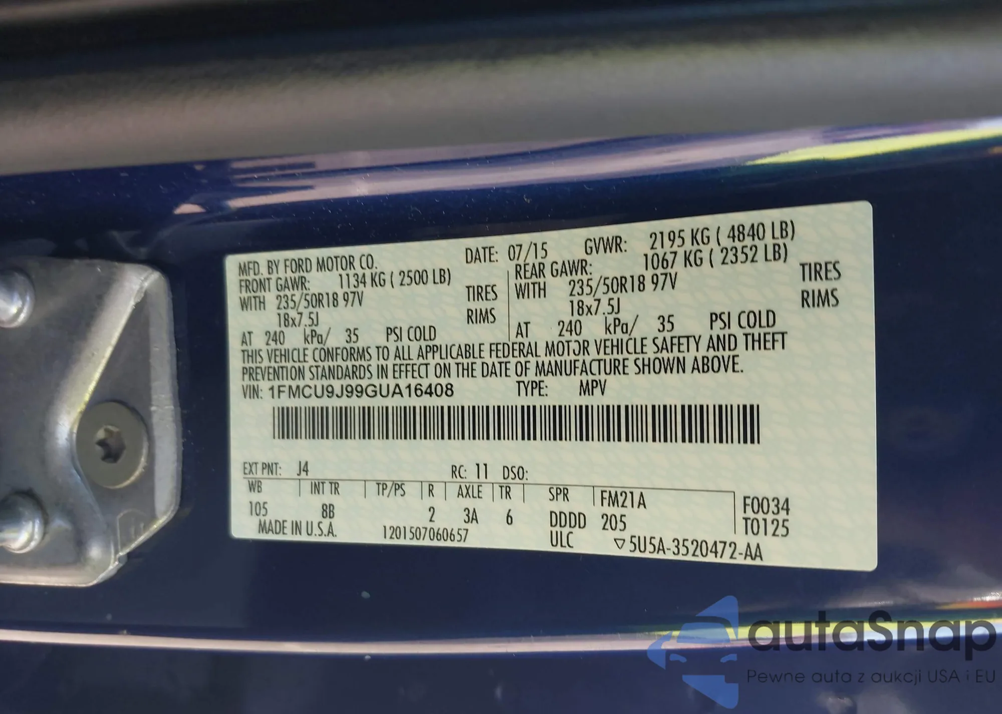 LOT: 41790495 VIN: 1FMCU9J99GUA16408
