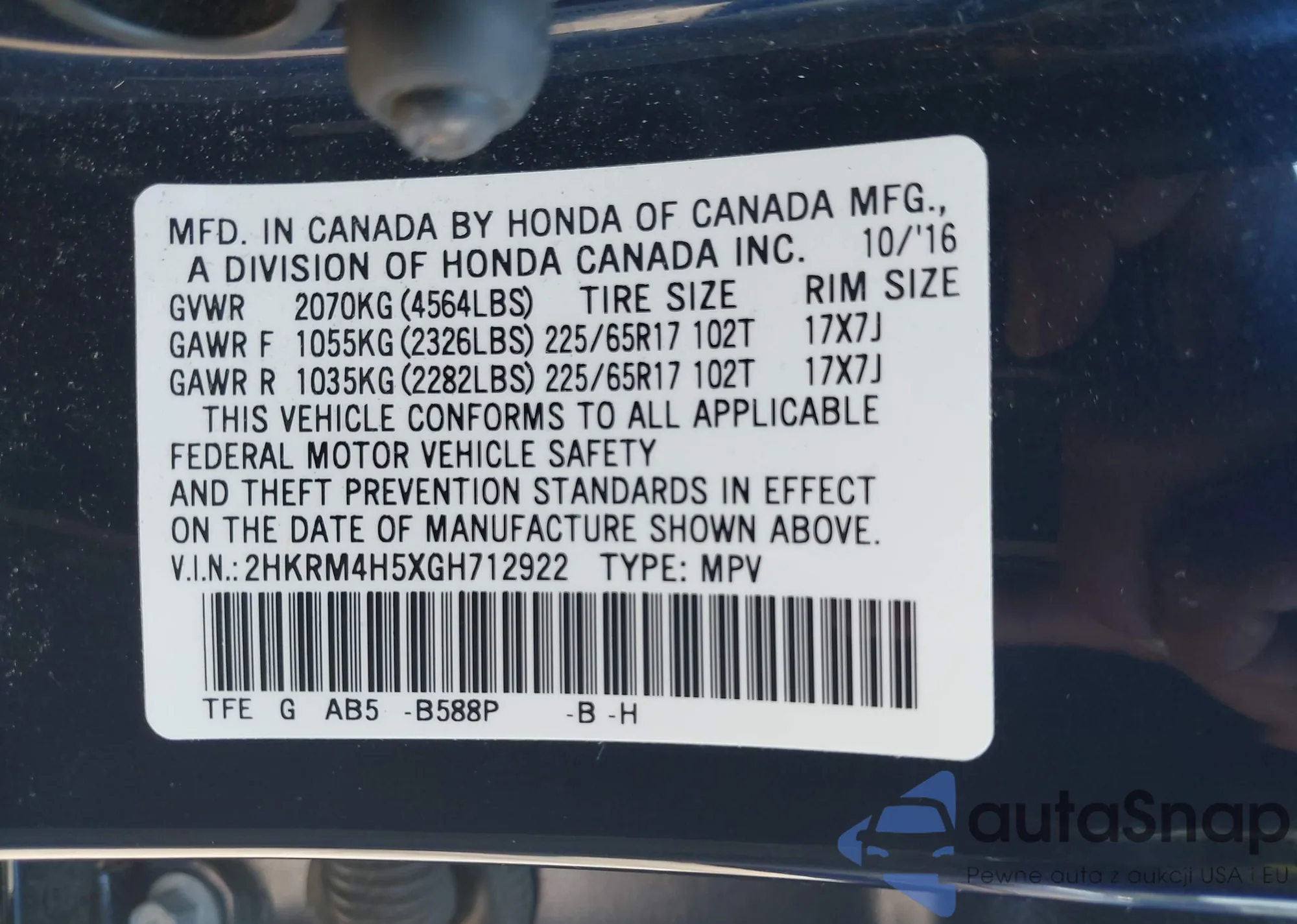 • VIN 2HKRM4H5XGH712922