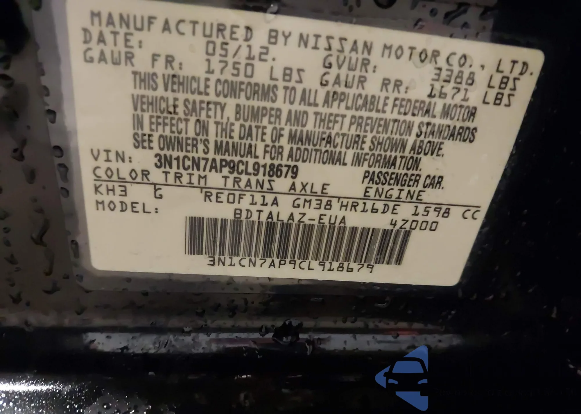 • VIN 3N1CN7AP9CL918679