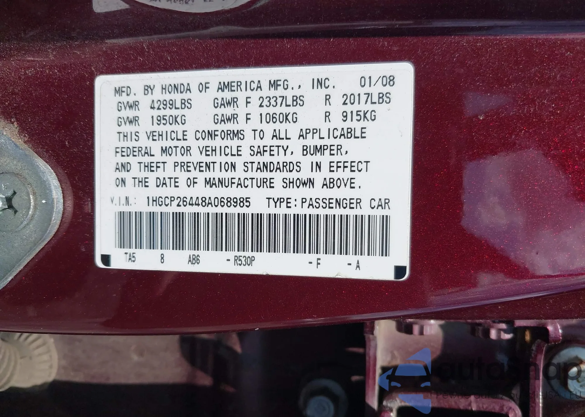 LOT: 42528526 VIN: 1HGCP2F40CA184354