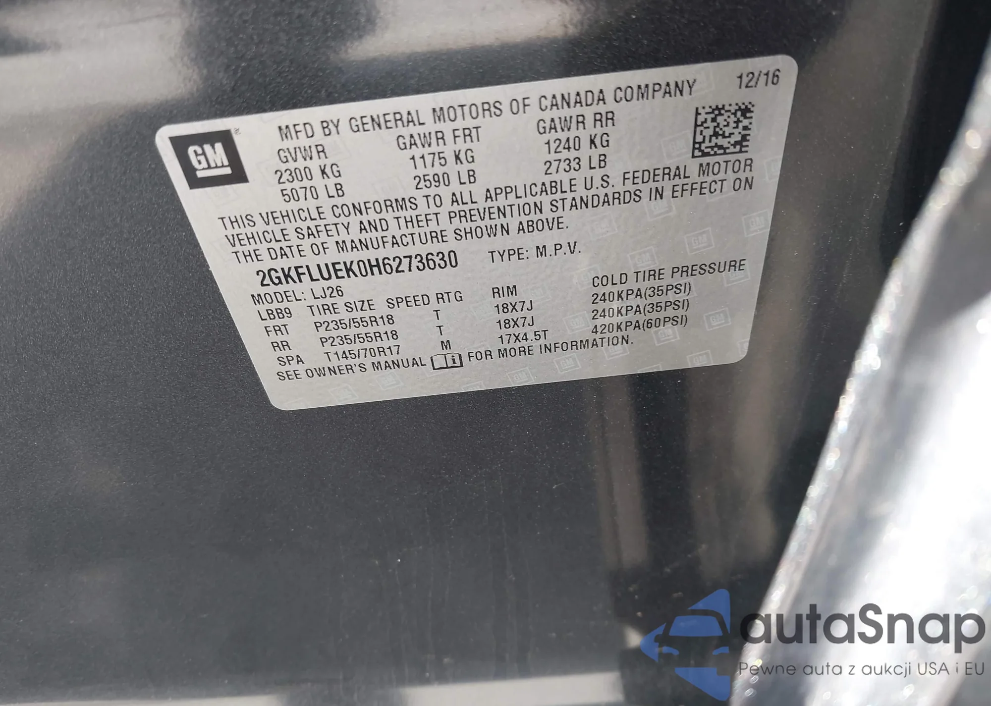 • VIN 2GKFLUEK0H6273630