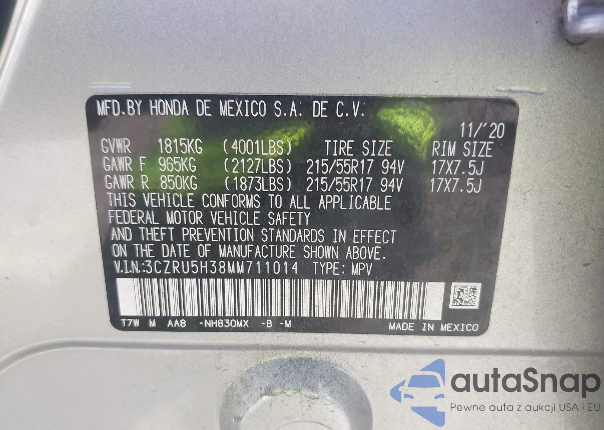 • VIN 3CZRU5H38MM711014