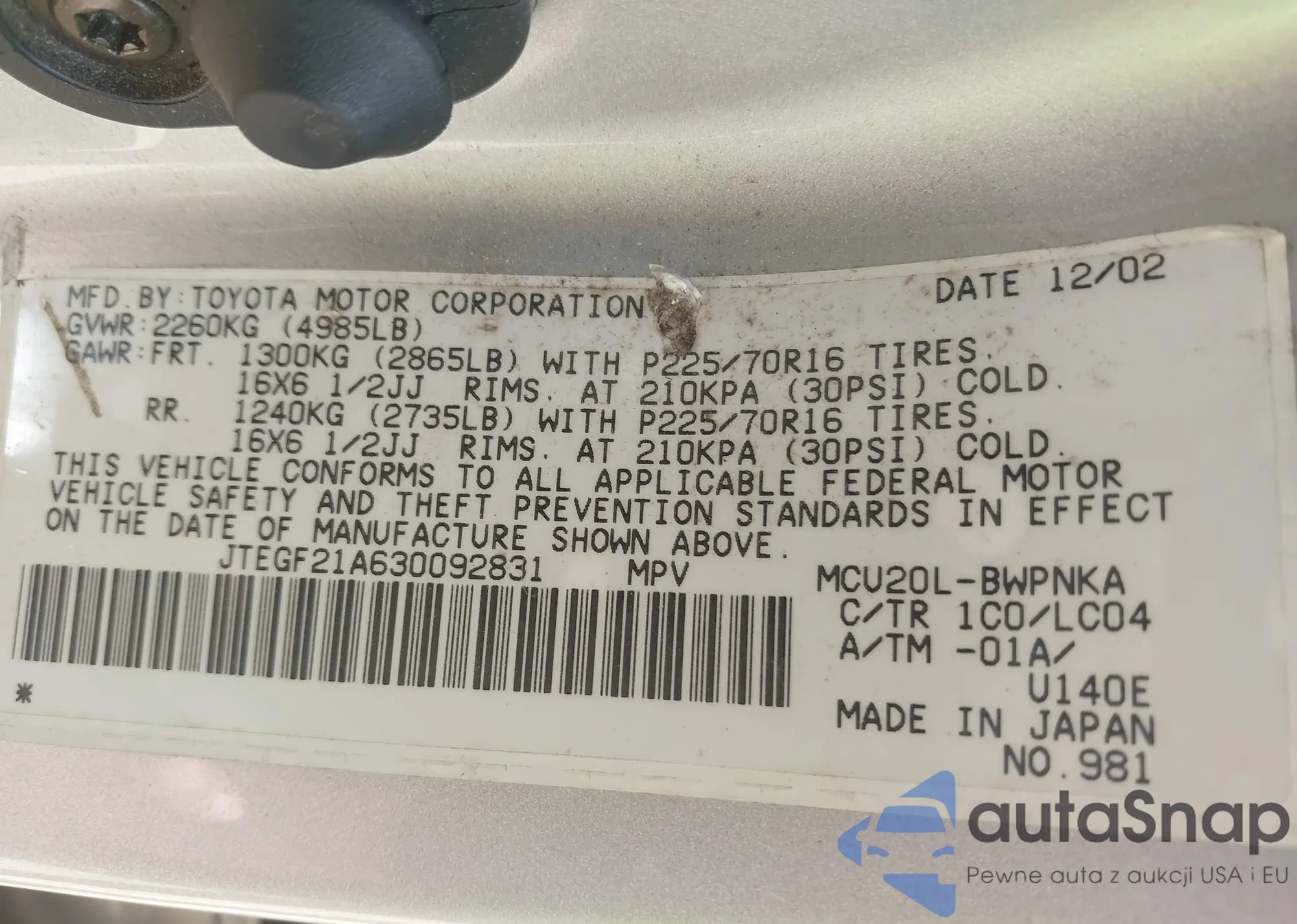 LOT: 42586655 VIN: JTEGF21A630092831