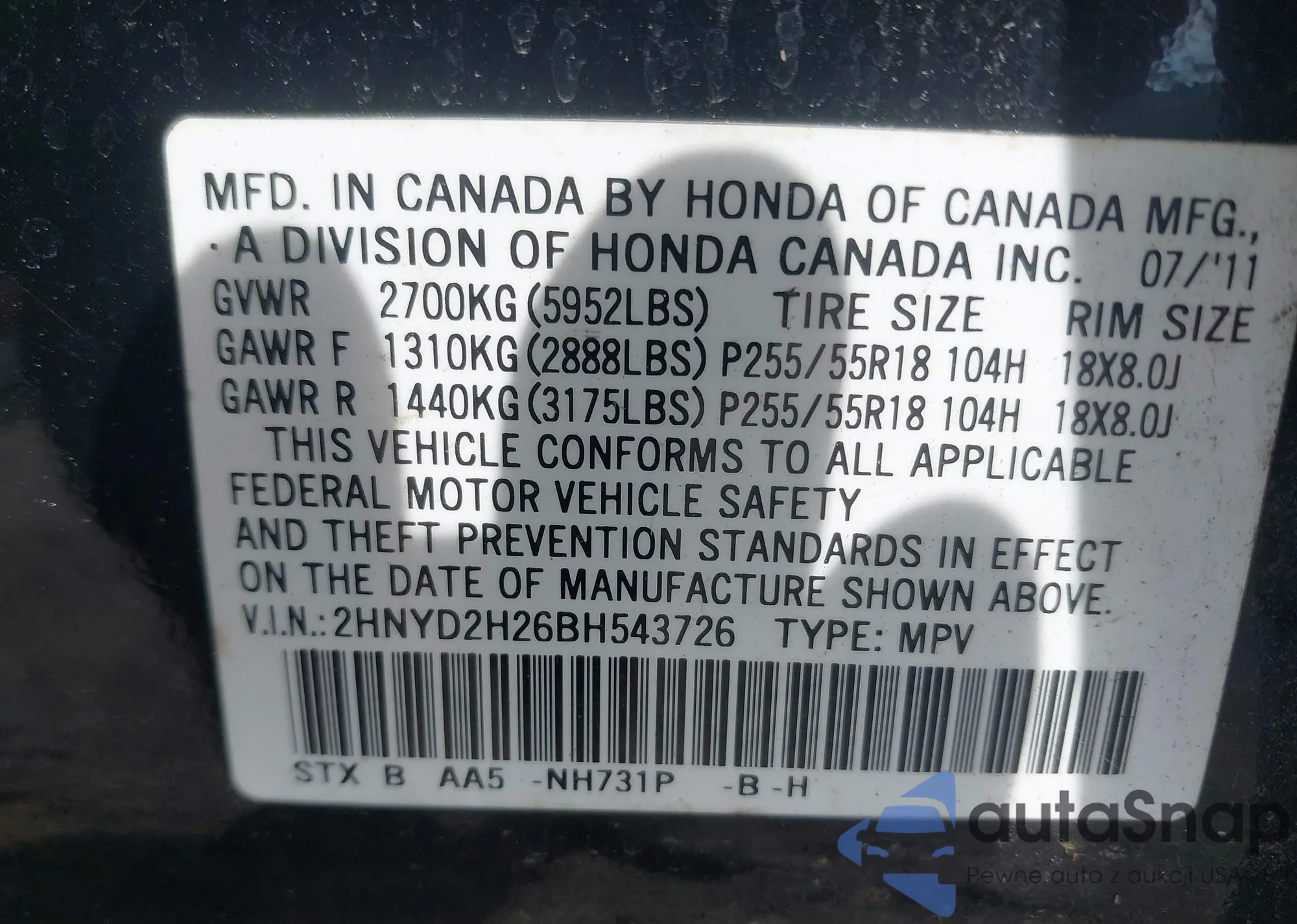 LOT: 42631954 VIN: 2HNYD2H26BH543726