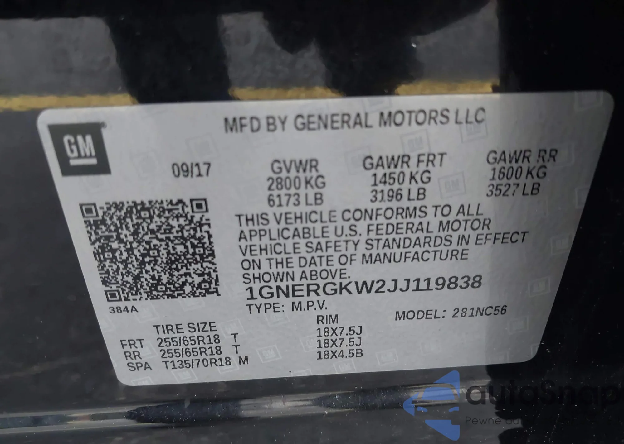 LOT: 42193729 VIN: 1GNERGKW2JJ119838
