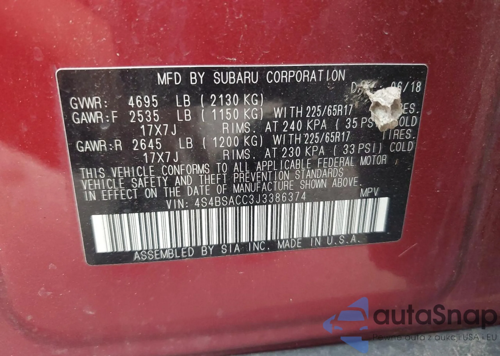 • VIN 4S4BSACC3J3386374