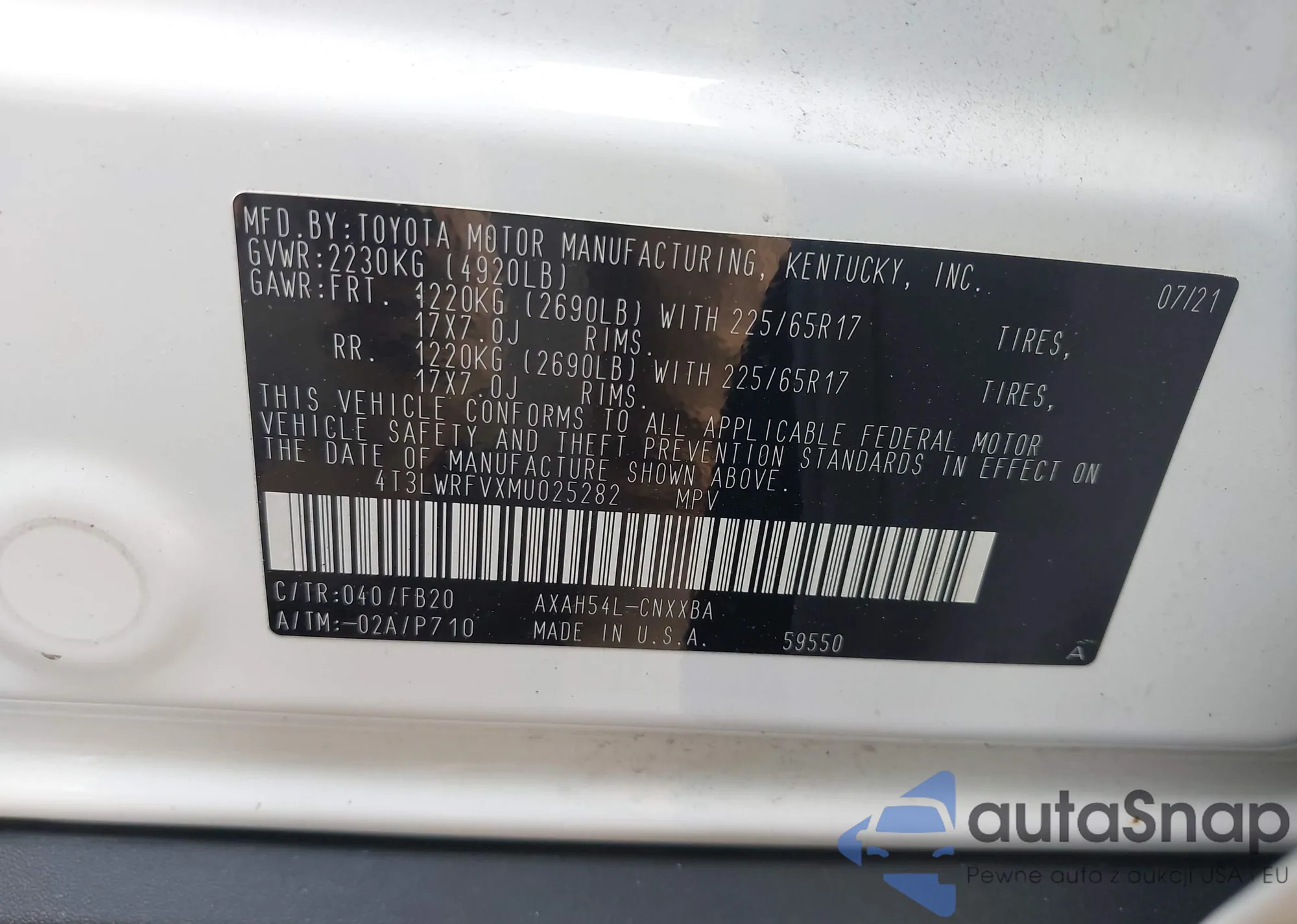 LOT: 42347407 VIN: 4T3LWRFVXMU025282