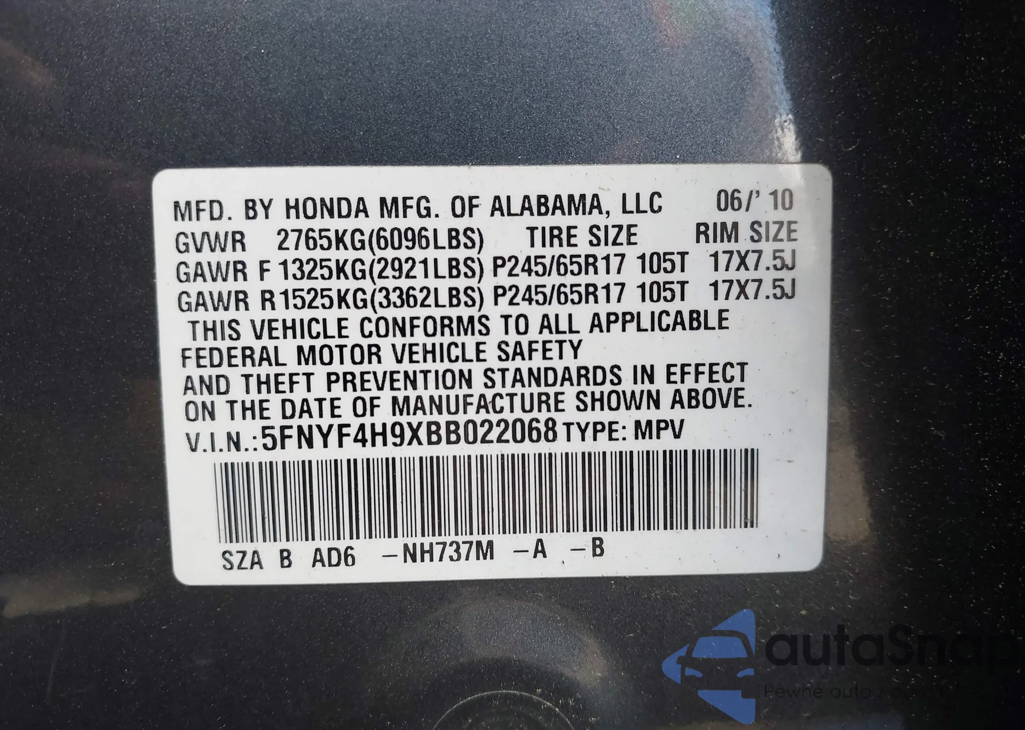 • VIN 5FNYF4H9XBB022068