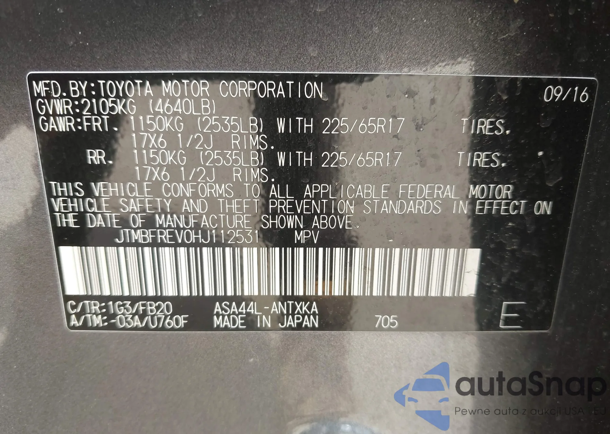 LOT: 42570843 VIN: JTMBFREV0HJ112531
