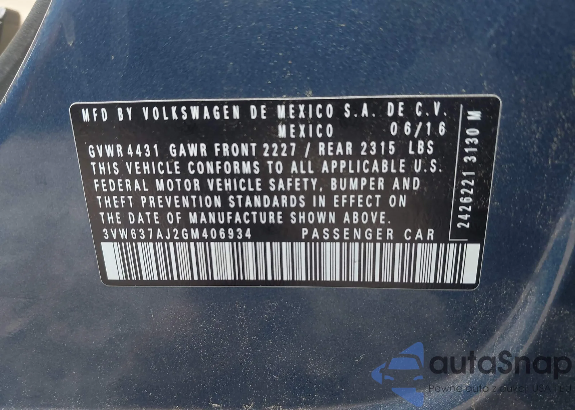 • VIN 3VW637AJ2GM406934