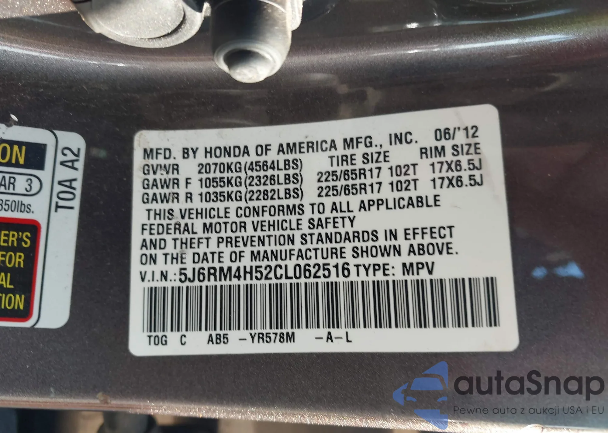 • VIN 5J6RM4H52CL062516