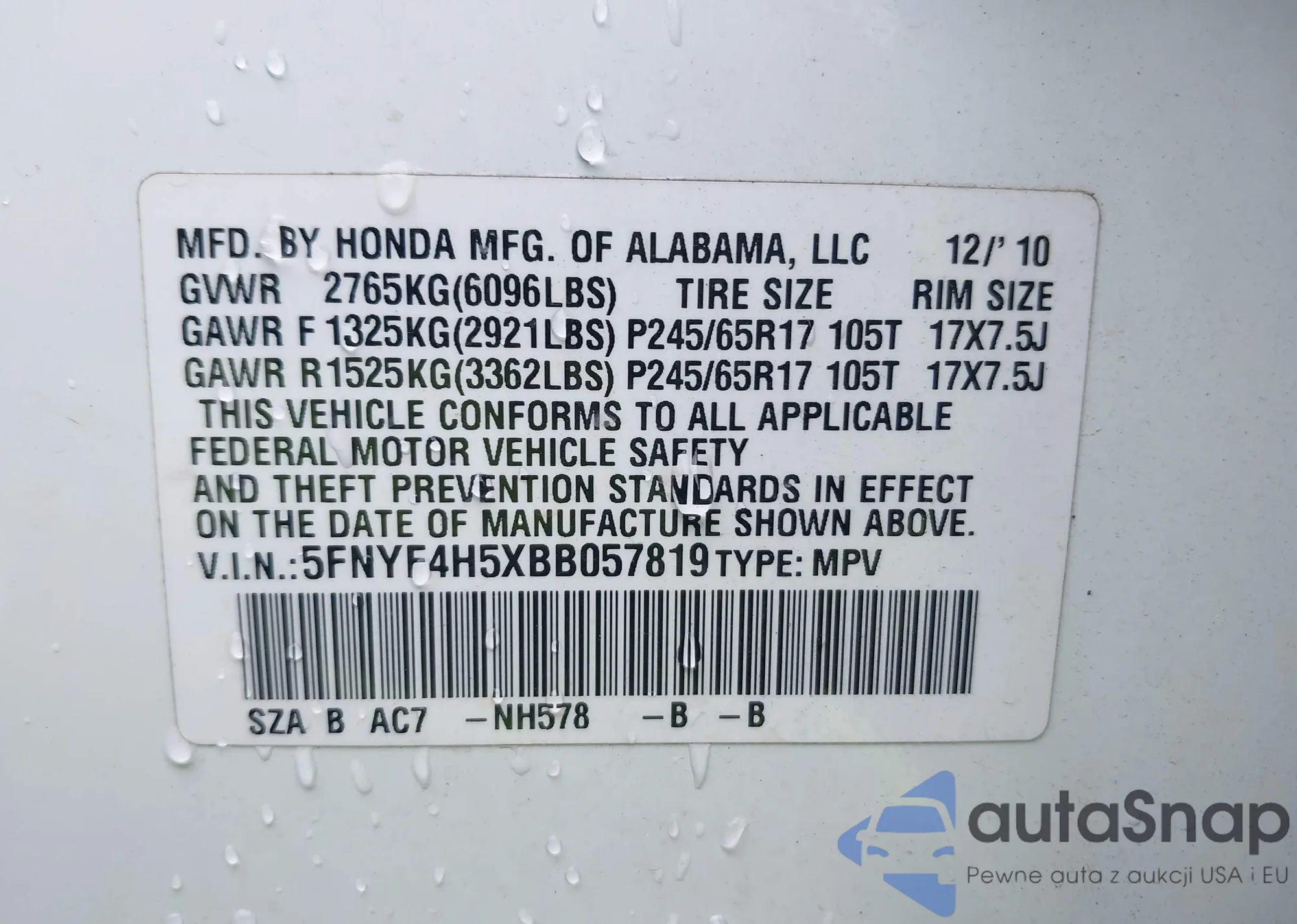 • VIN 5FNYF4H5XBB057819