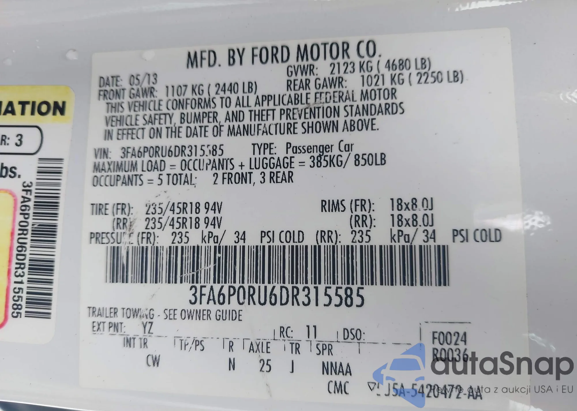 LOT: 42598359 VIN: 3FA6P0RU6DR315585
