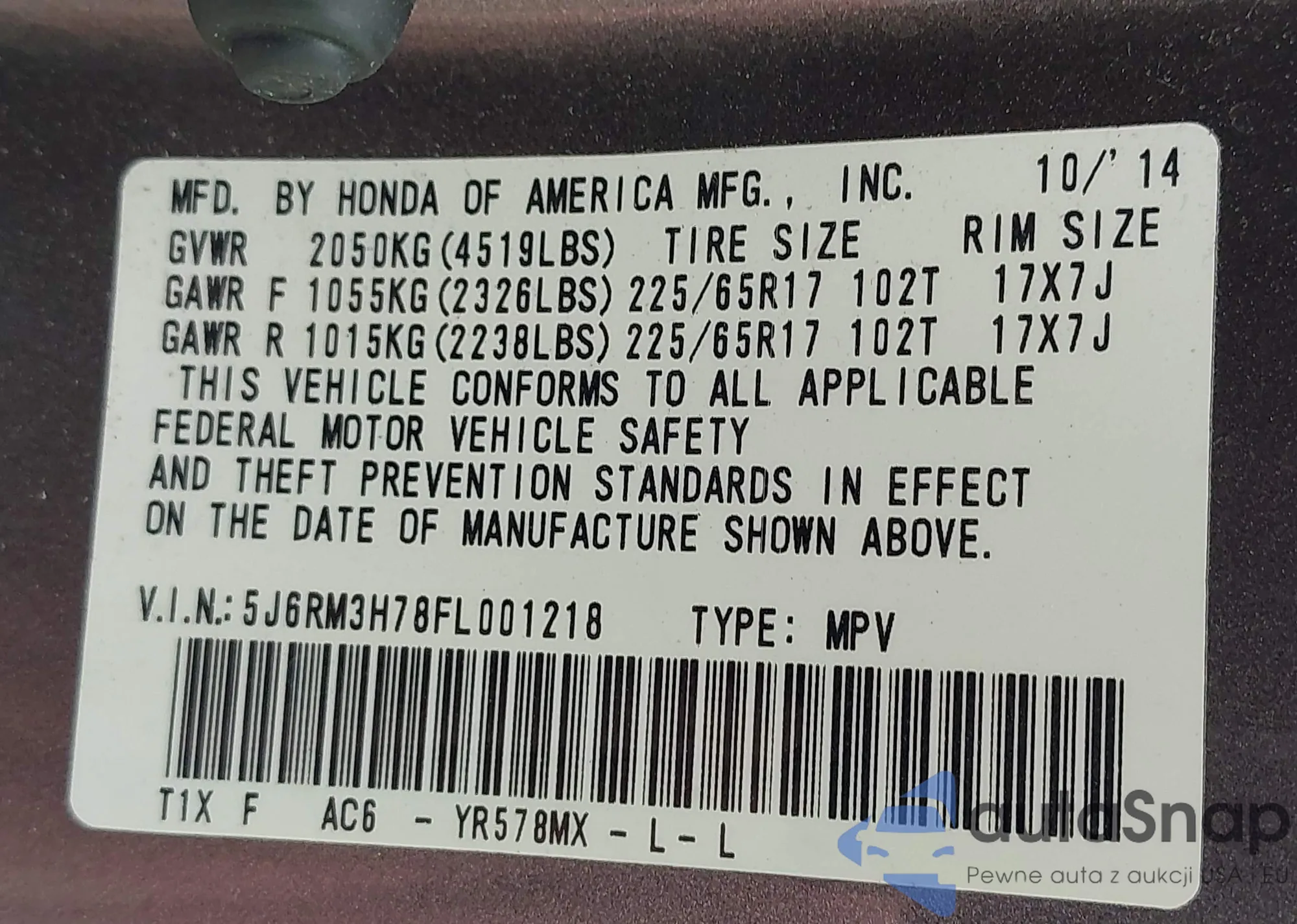 LOT: 42226016 VIN: 5J6RM3H78FL001218