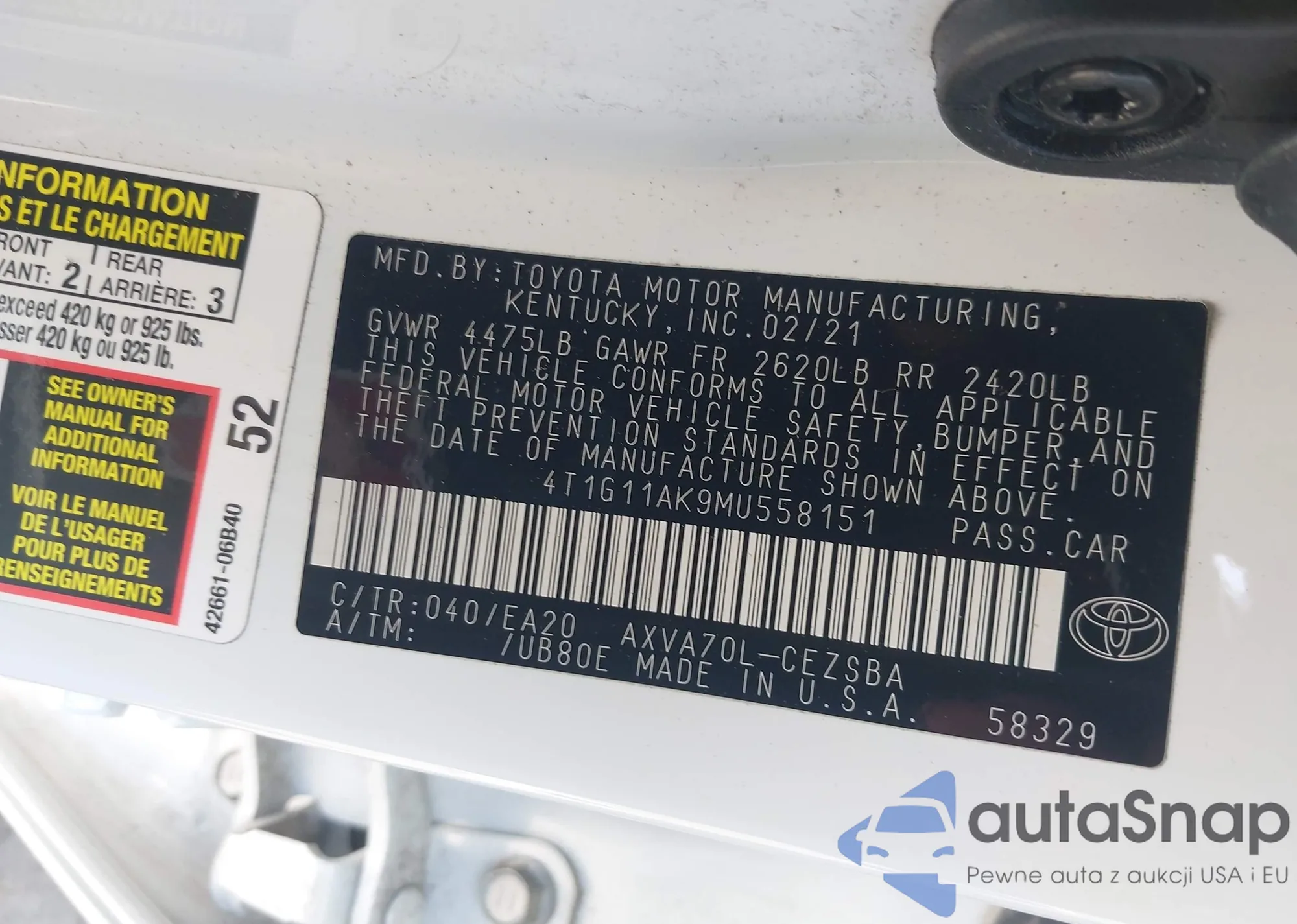 LOT: 42595378 VIN: 4T1G11AK9MU558151