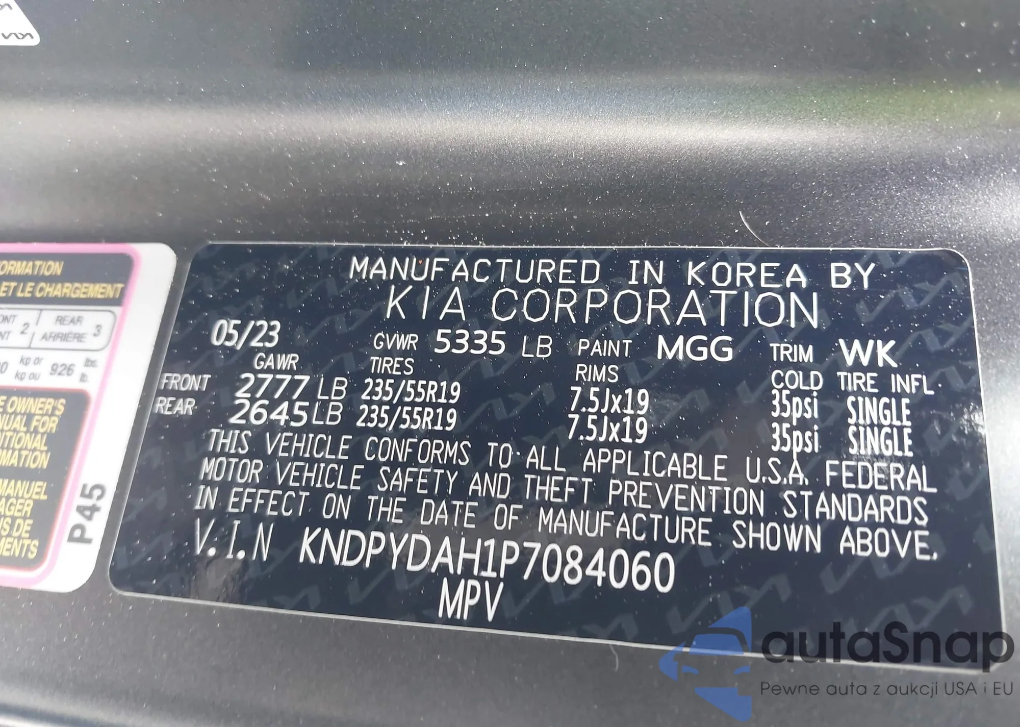 • VIN KNDPYDAH1P7084060