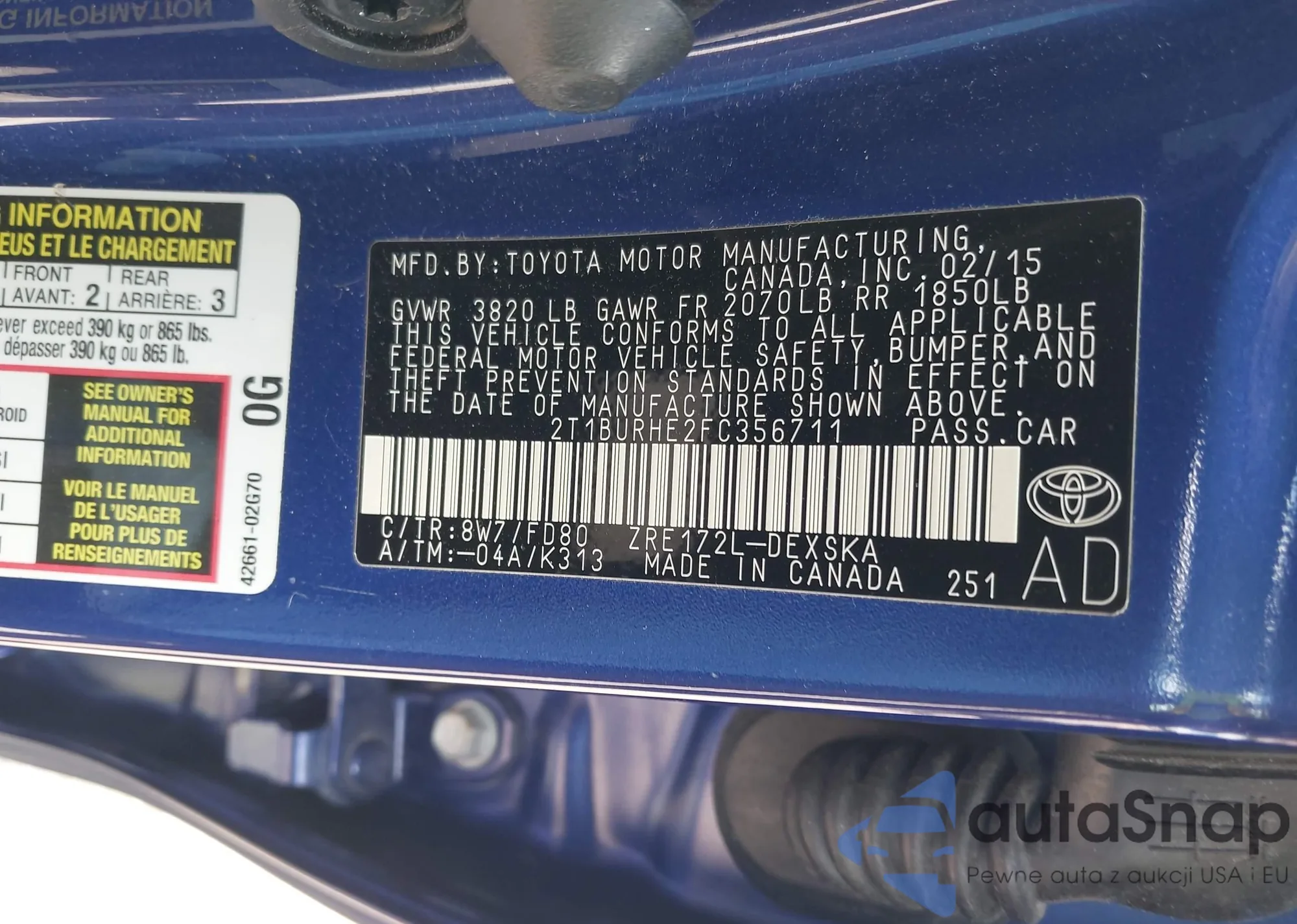 LOT: 42204102 VIN: 2T1BURHE2FC356711