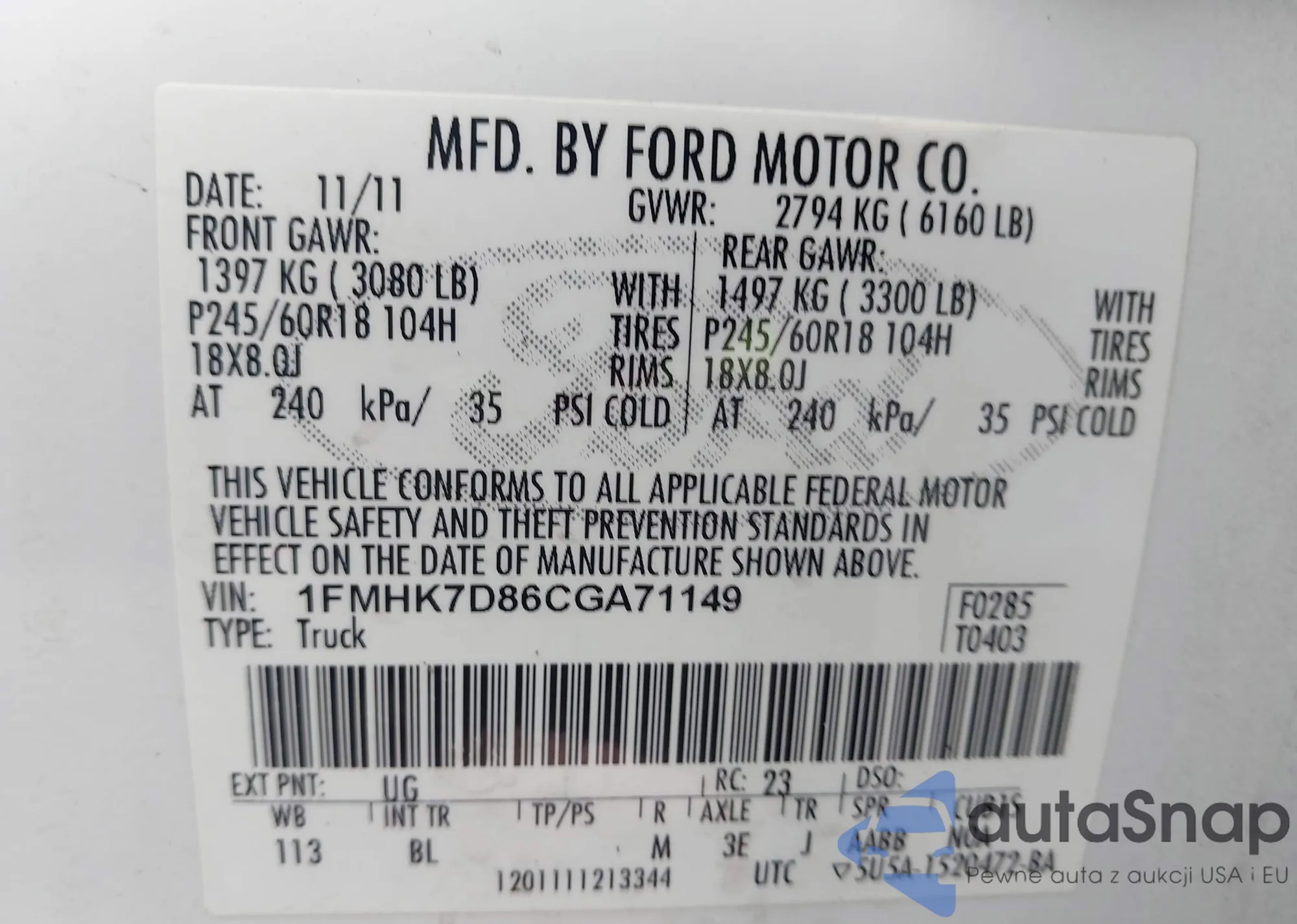 LOT: 42081625 VIN: 1FMHK7D86CGA71149