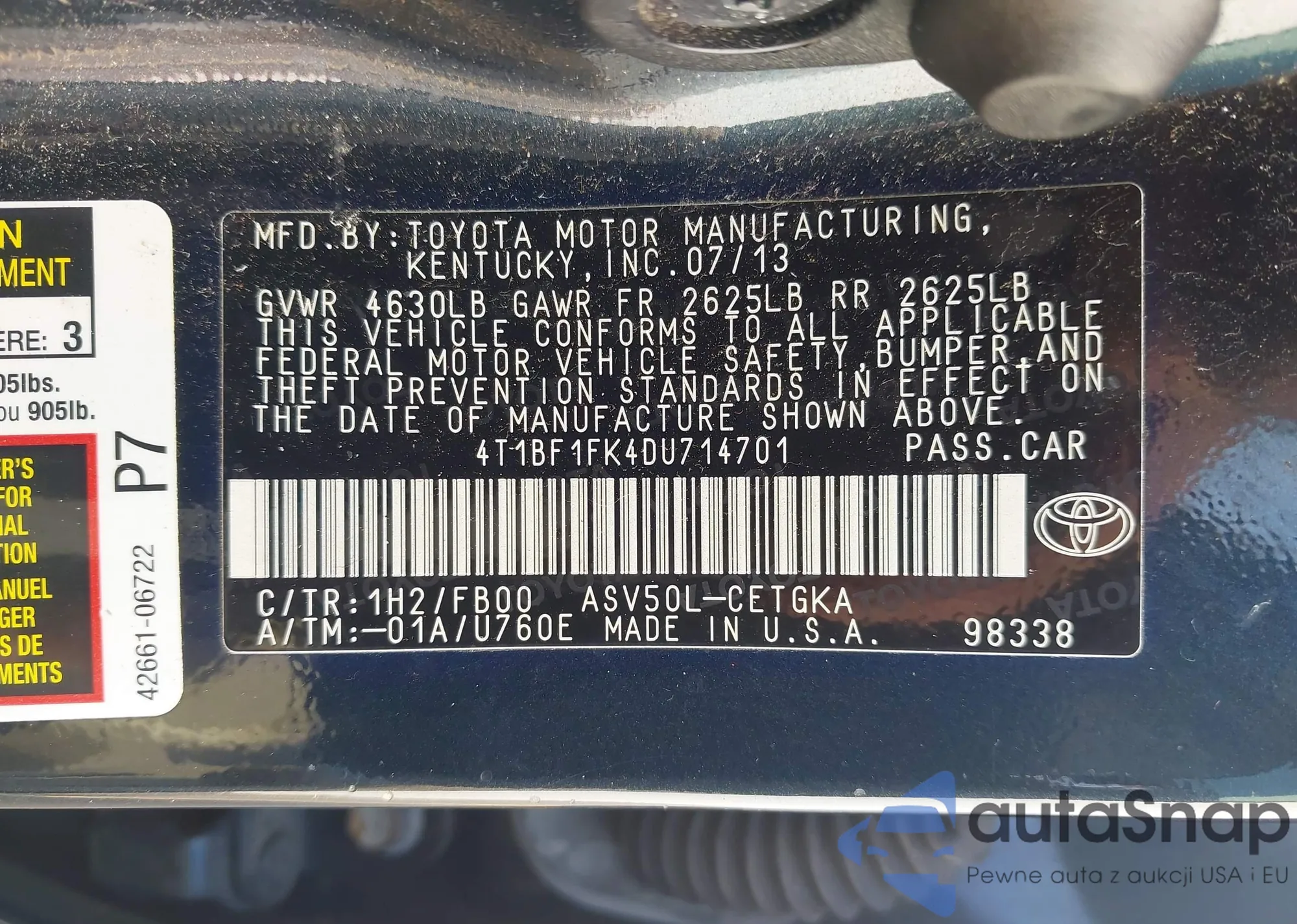 LOT: 42546271 VIN: 4T1BF1FK4DU714701