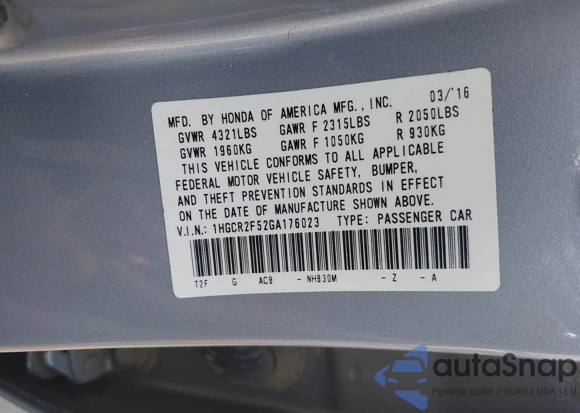 • VIN 1HGCR2F52GA176023